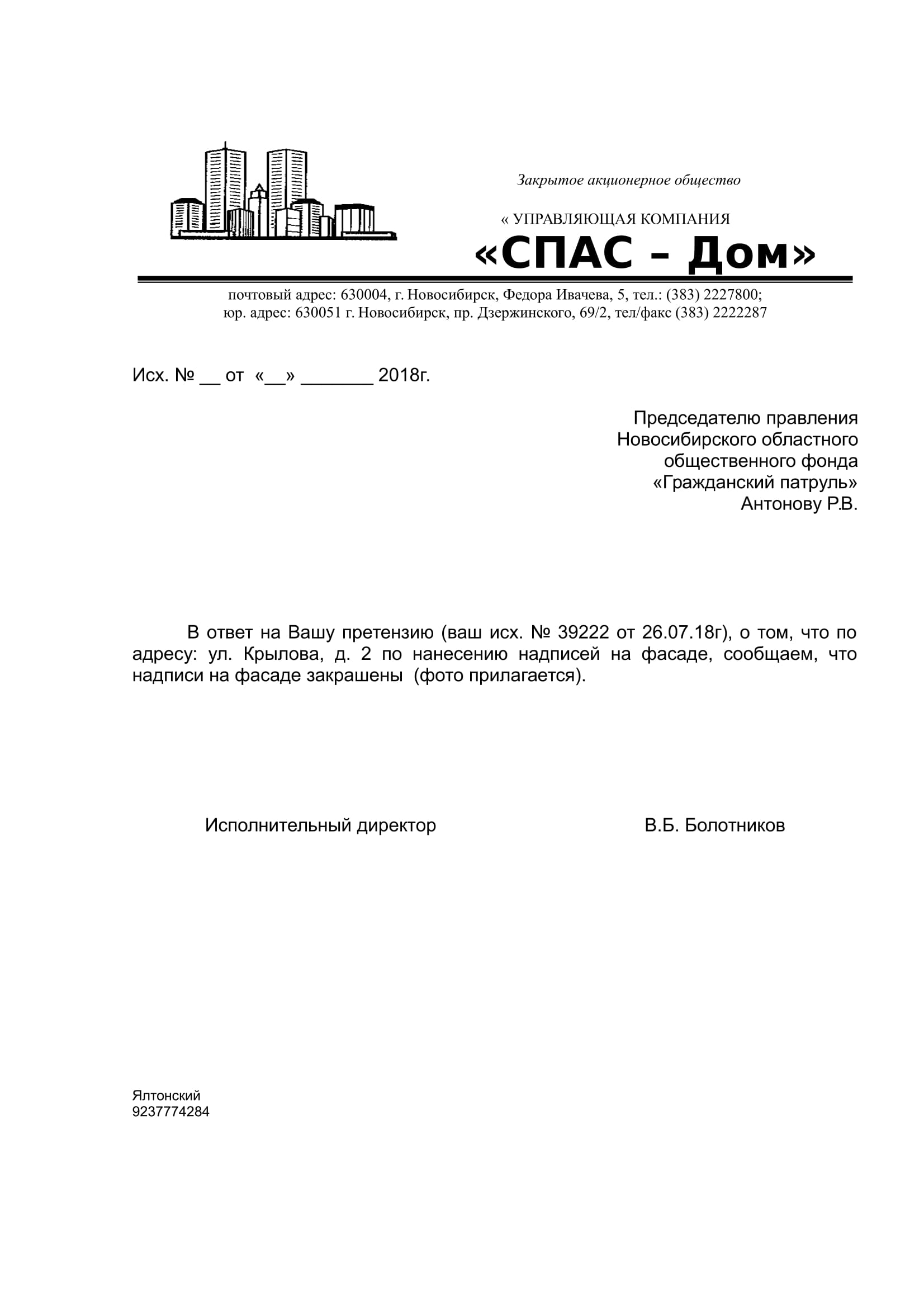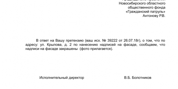 Номер жалобы:39222 Тип жалобы:Иные проблемы ЖКХ Название объекта:Управляющая Компания Регион:Новосибирская область Город:Новосибирск Адрес:ул. Крылова, 2 Описание жалобы:Надписи на фасаде дома Статус:
