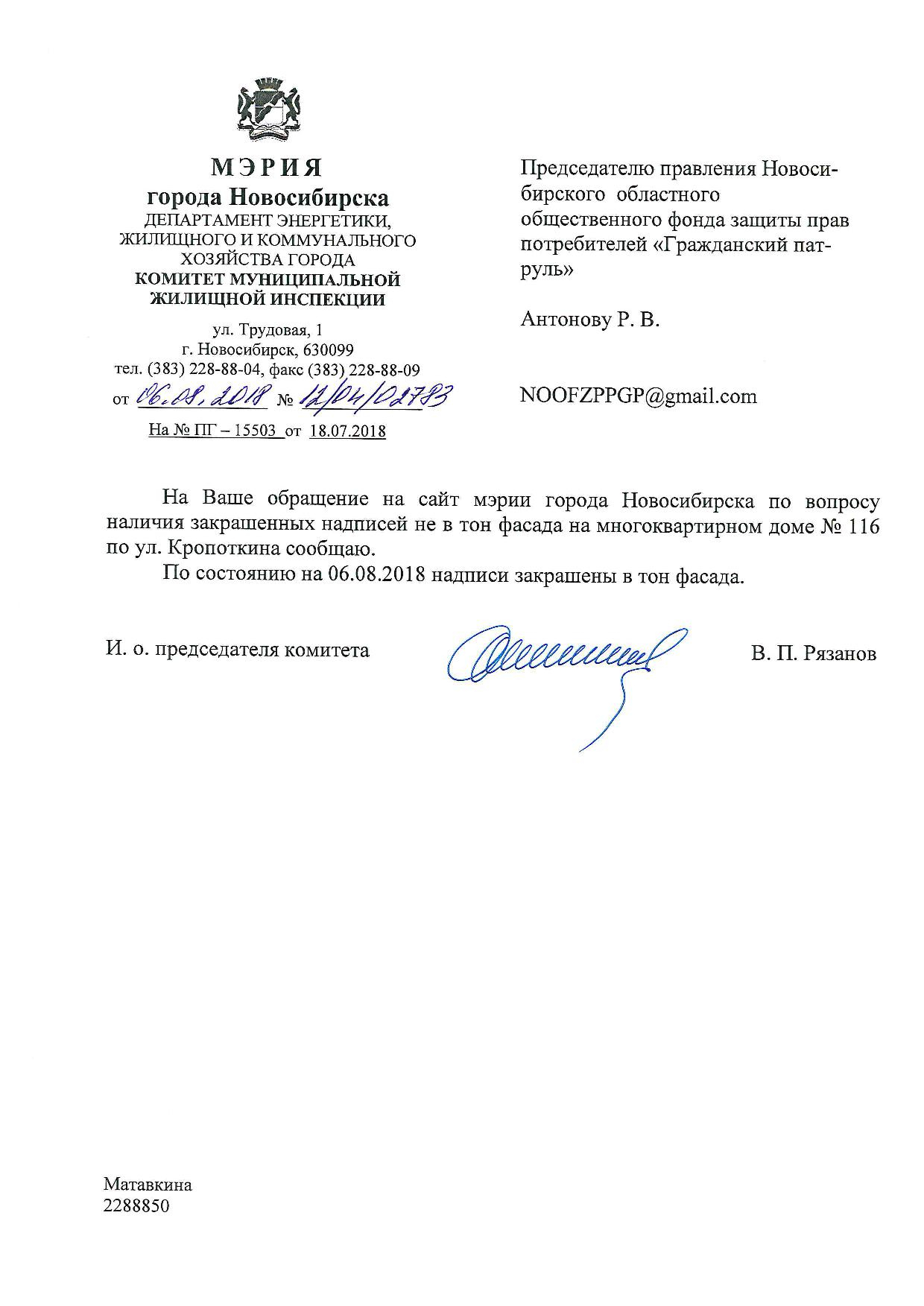 Номер жалобы:38708 Тип жалобы:Иные проблемы ЖКХ Название объекта:Управляющая Компания Регион:Новосибирская область Город:Новосибирск Адрес:ул. Кропоткина, 116 Описание жалобы:Надписи на фасаде дома закрашены не в тон Статус: