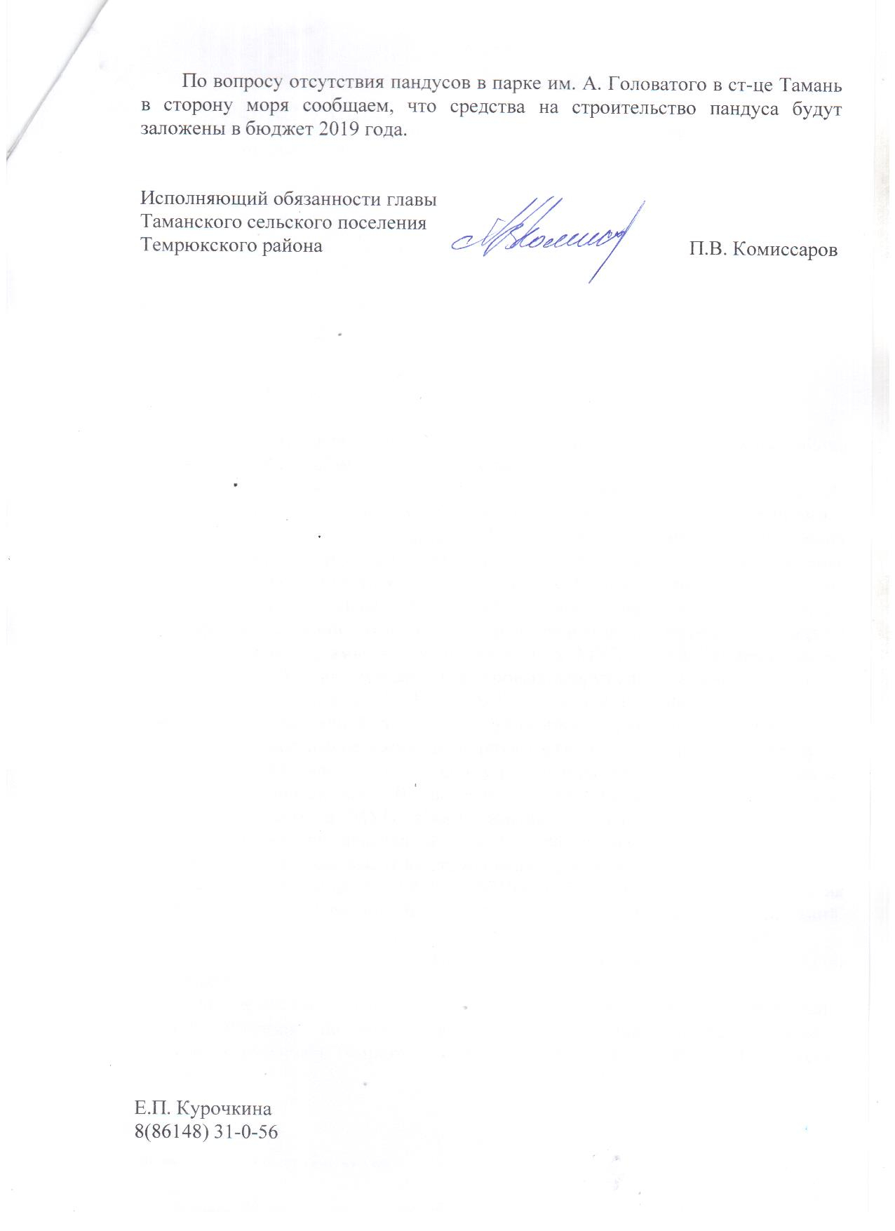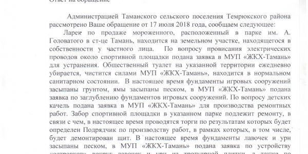19. Администрацию станицы Тамань прошу пояснить почему в парке это уже 3 детский городок на такой маленькой территории а во всей станице больше таких городков нет. Данный парк расположен в 3 минутах от администрации города, в чем вижу использование служебного положения в личных целях, для своих семей, детей. Все деньги станицы на благоустройство завязаны на этом парке- больше ни в какие дворы и улицы они не идут.