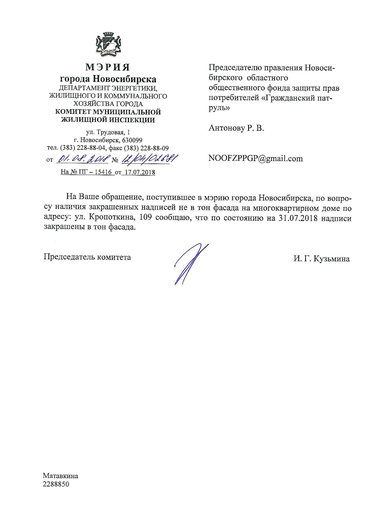 Номер жалобы:38658 Тип жалобы:Иные проблемы ЖКХ Название объекта:Управляющая Компания Регион:Новосибирская область Город:Новосибирск Адрес:ул. Кропоткина, 109 Описание жалобы:Надписи на фасаде дома закрашены не в тон Статус: