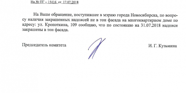 Номер жалобы:38654 Тип жалобы:Иные проблемы ЖКХ Название объекта:Управляющая Компания Регион:Новосибирская область Город:Новосибирск Адрес:Красный пр., 88 Описание жалобы:Надписи на фасаде дома Статус:
