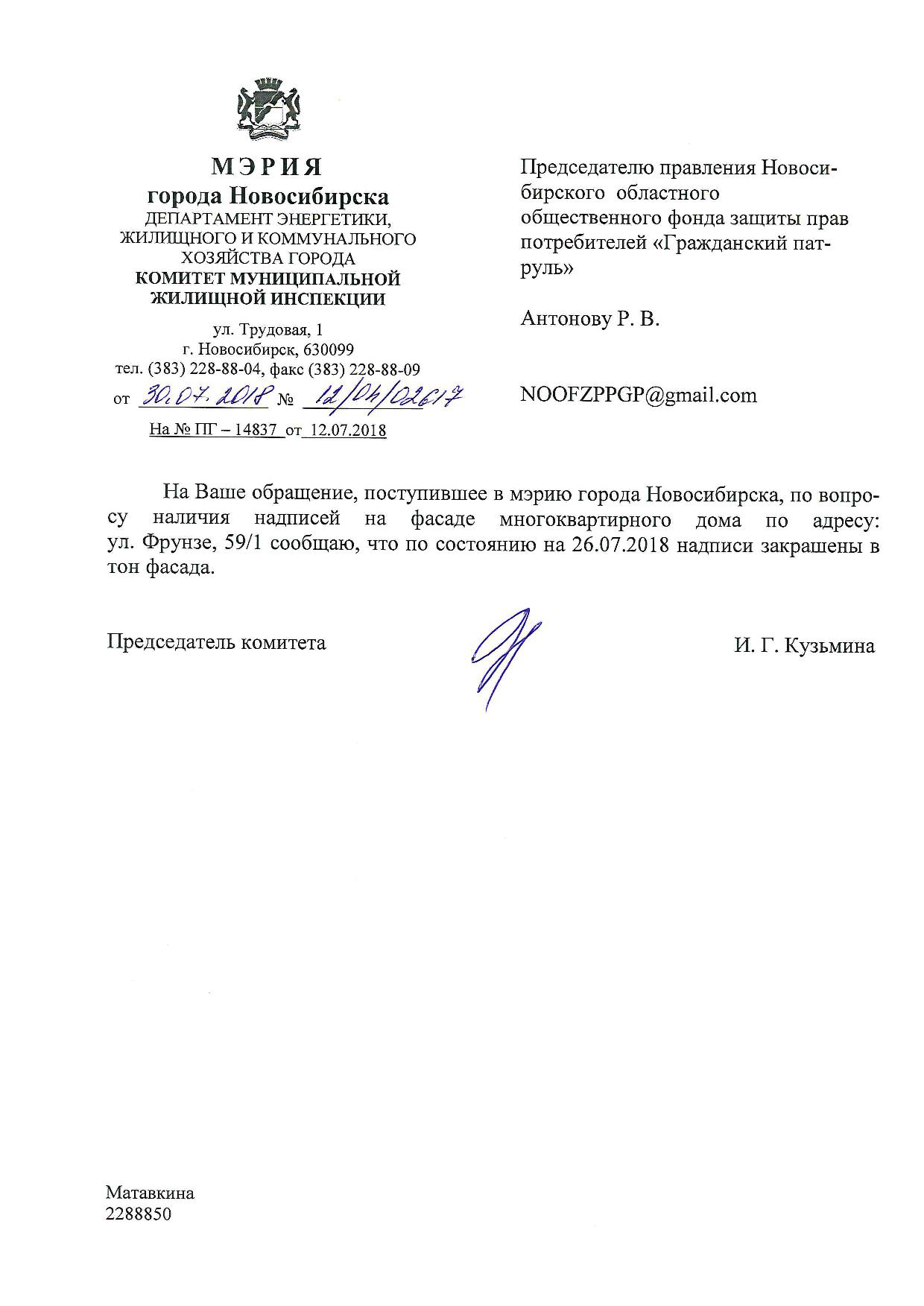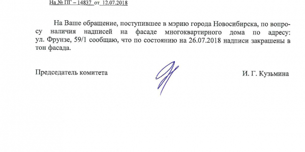 Номер жалобы:38524 Тип жалобы:Иные проблемы ЖКХ Название объекта:Управляющая Компания Регион:Новосибирская область Город:Новосибирск Адрес:ул. Фрунзе, 59/1 Описание жалобы:Надписи на фасаде дома Статус: