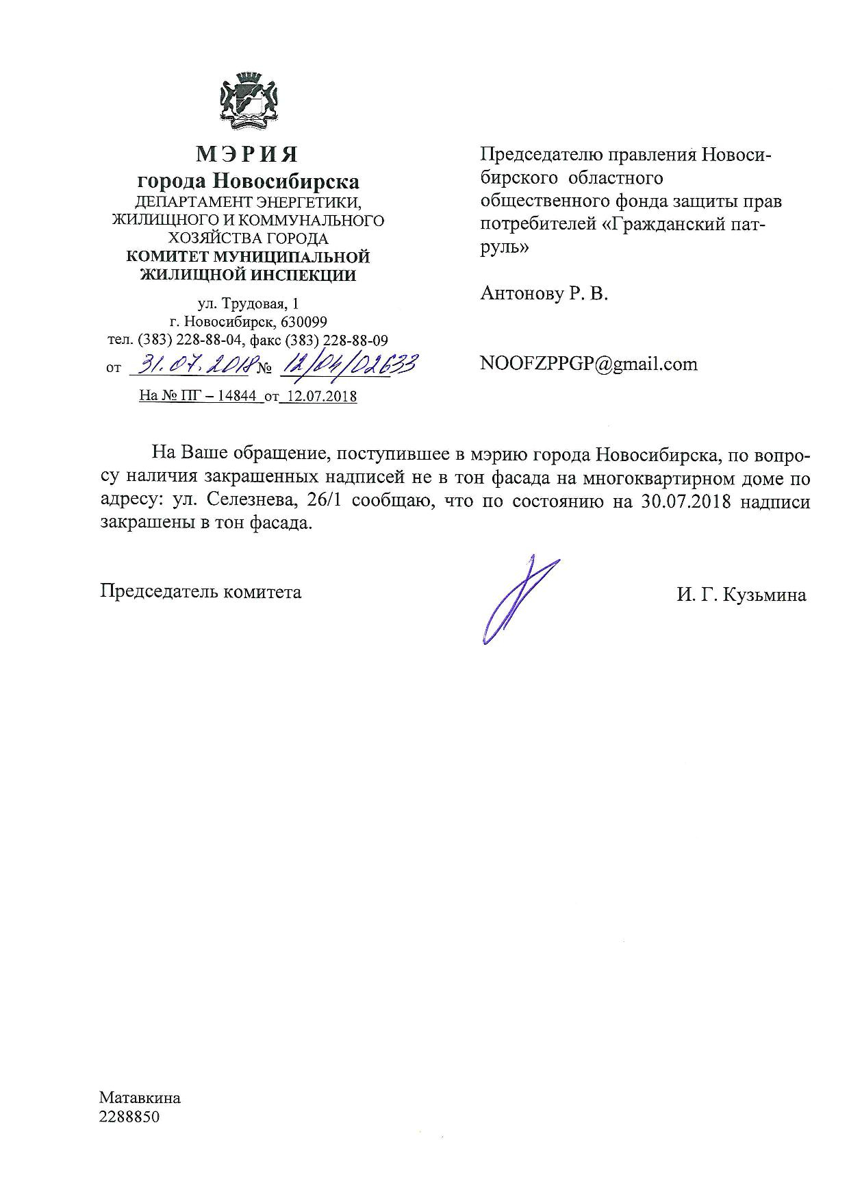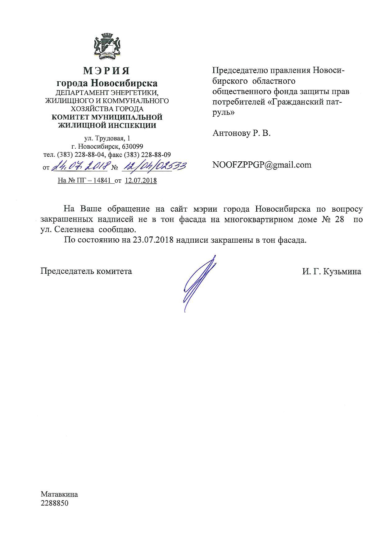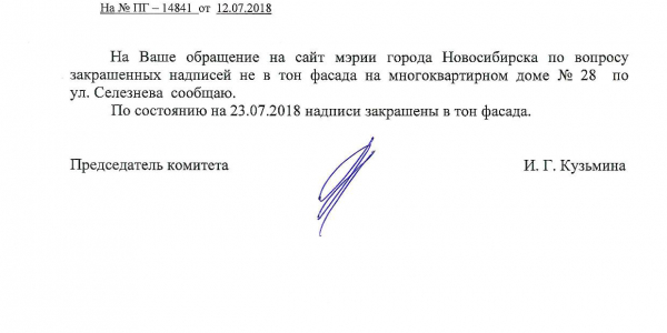 Номер жалобы:38528 Тип жалобы:Иные проблемы ЖКХ Название объекта:Управляющая Компания Регион:Новосибирская область Город:Новосибирск Адрес:ул. Селезнева, 28 Описание жалобы:Надписи на фасаде дома закрашены не в тон Статус: