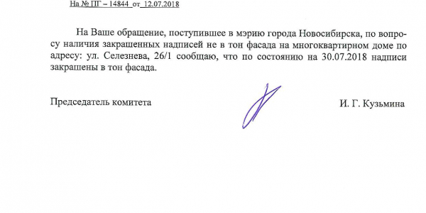 Номер жалобы:38527 Тип жалобы:Иные проблемы ЖКХ Название объекта:Управляющая Компания Регион:Новосибирская область Город:Новосибирск Адрес:ул. Селезнева, 26/1 Описание жалобы:Надписи на фасаде дома закрашены не в тон Статус: