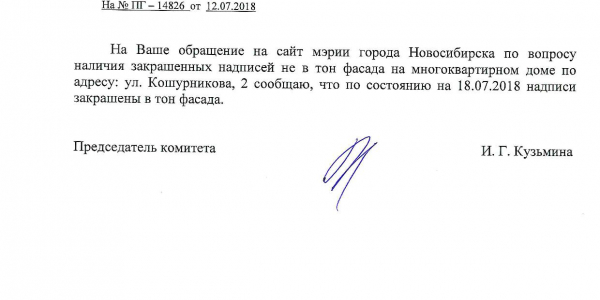 Номер жалобы:38530 Тип жалобы:Иные проблемы ЖКХ Название объекта:Управляющая Компания Регион:Новосибирская область Город:Новосибирск Адрес:ул. Кошурникова, 2 Описание жалобы:Надписи на фасаде дома закрашены не в тон Статус:
