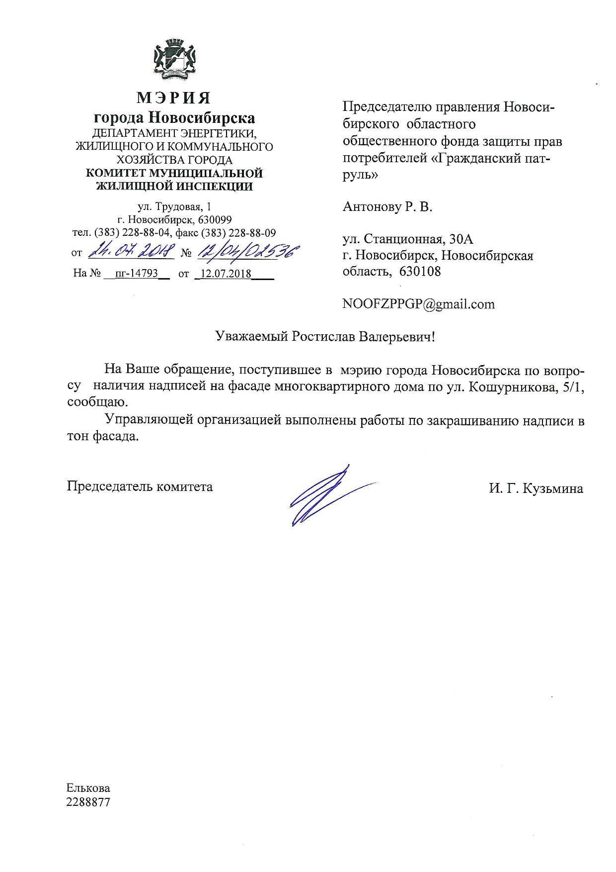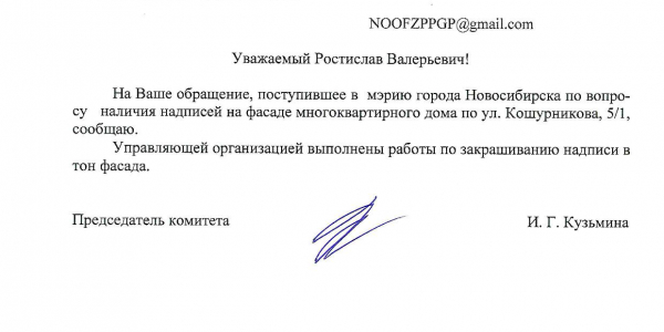 Номер жалобы:38405 Тип жалобы:Иные проблемы ЖКХ Название объекта:Управляющая Компания Регион:Новосибирская область Город:Новосибирск Адрес:ул. Кошурникова, 5/1 Описание жалобы:Надписи на фасаде дома Статус: