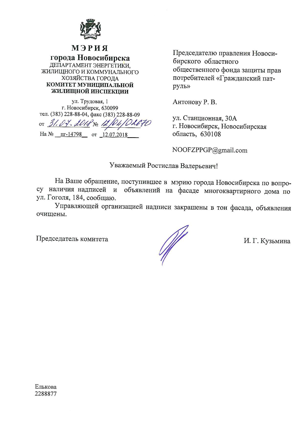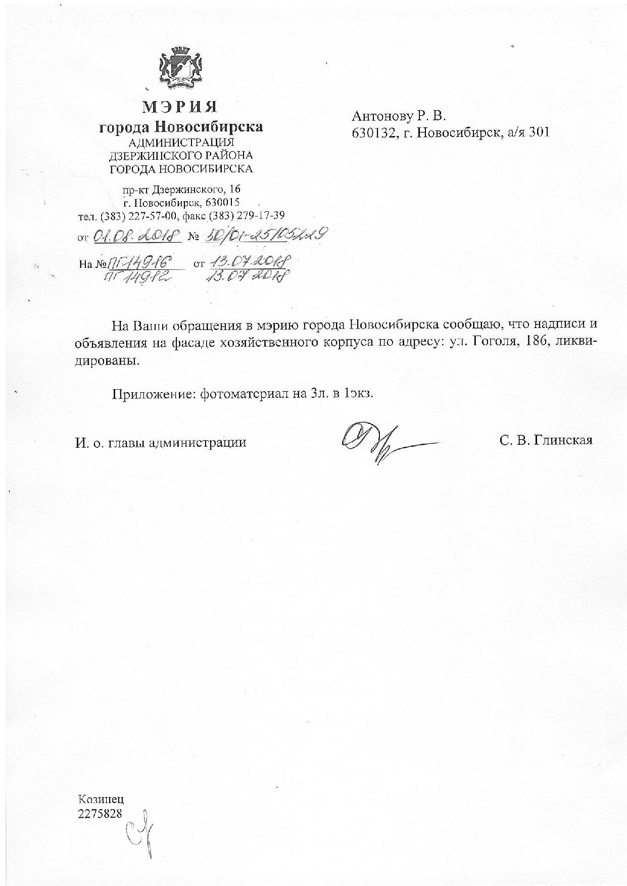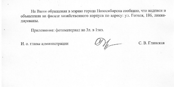 Номер жалобы:38414 Тип жалобы:Иные проблемы ЖКХ Название объекта:Управляющая Компания Регион:Новосибирская область Город:Новосибирск Адрес:ул. Гоголя, 186 Описание жалобы:Надписи на фасаде хоз корпуса Статус: