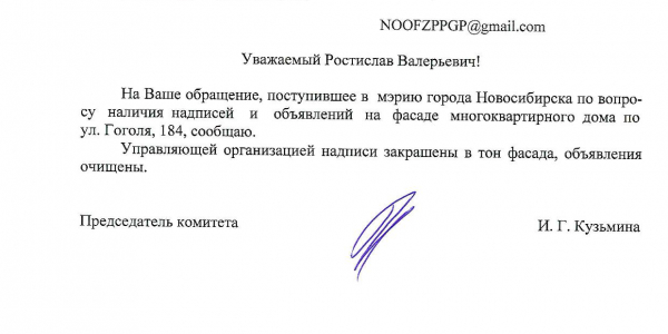 Номер жалобы:38406 Тип жалобы:Иные проблемы ЖКХ Название объекта:Управляющая Компания Регион:Новосибирская область Город:Новосибирск Адрес:ул. Гоголя, 184/1 Описание жалобы:Надписи на фасаде дома Статус: