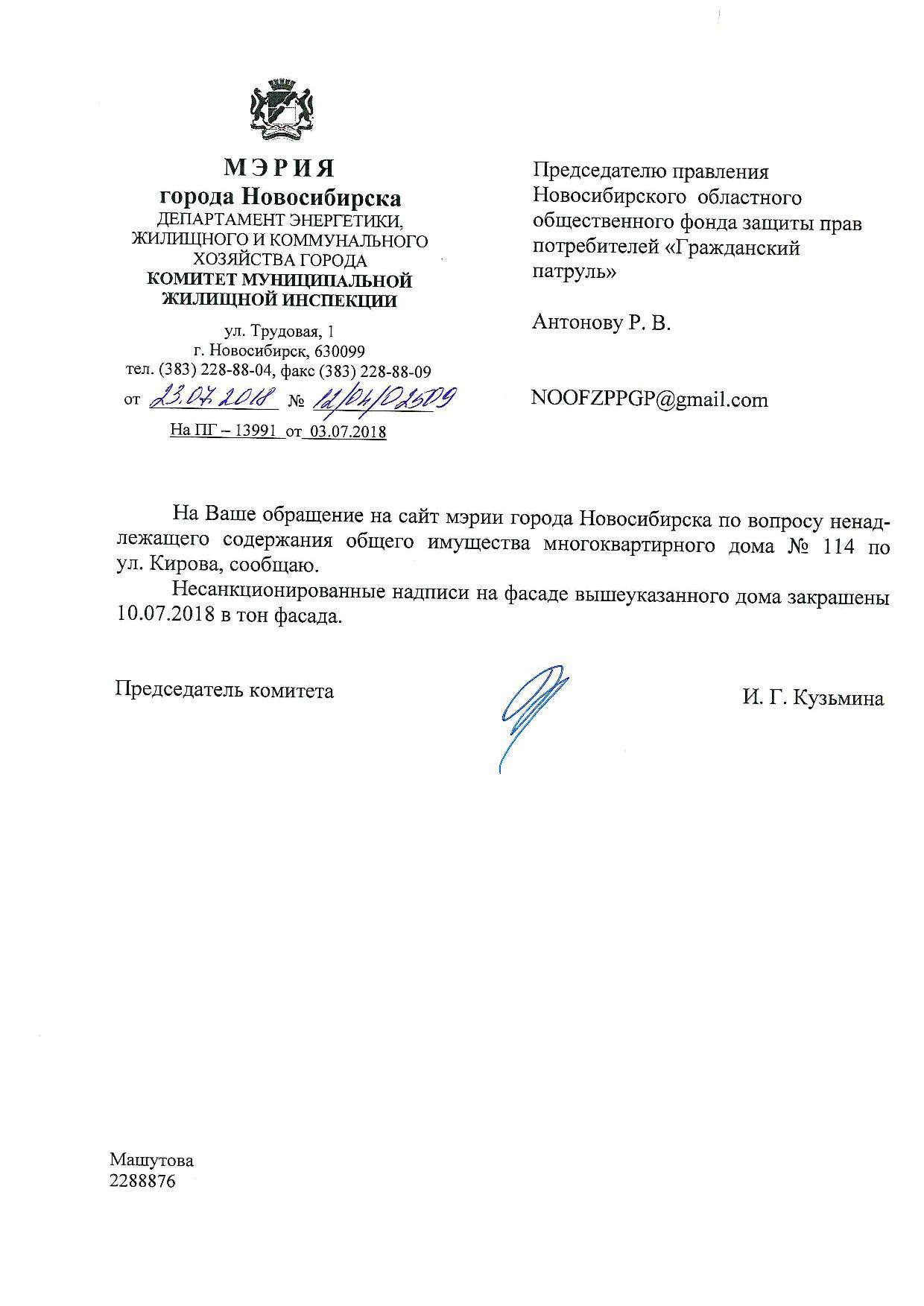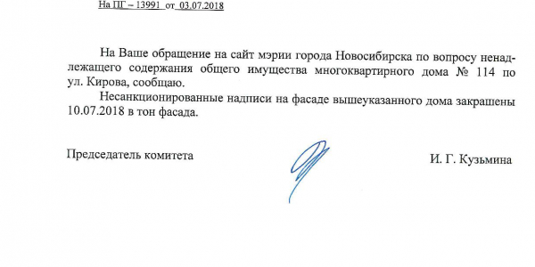 Номер жалобы:37741 Тип жалобы:Иные проблемы ЖКХ Название объекта:Управляющая Компания Регион:Новосибирская область Город:Новосибирск Адрес:ул. Кирова, 114 Описание жалобы:Надписи на фасаде дома Статус: