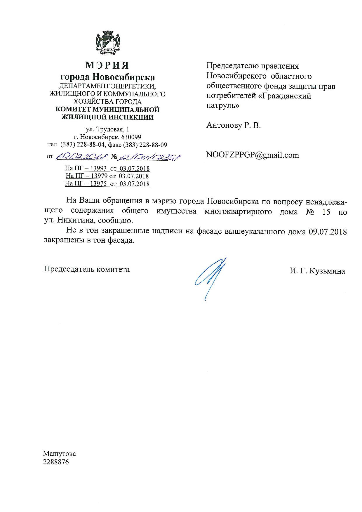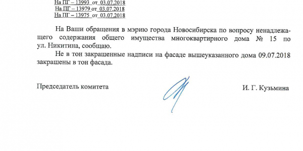 Номер жалобы:37747 Тип жалобы:Иные проблемы ЖКХ Название объекта:Управляющая Компания Регион:Новосибирская область Город:Новосибирск Адрес:ул. Никитина, 15 Описание жалобы:Надписи на фасаде дома закрашены не в тон Статус:
