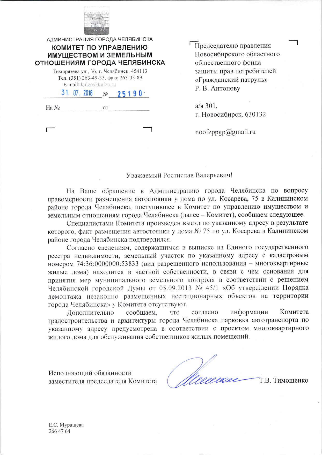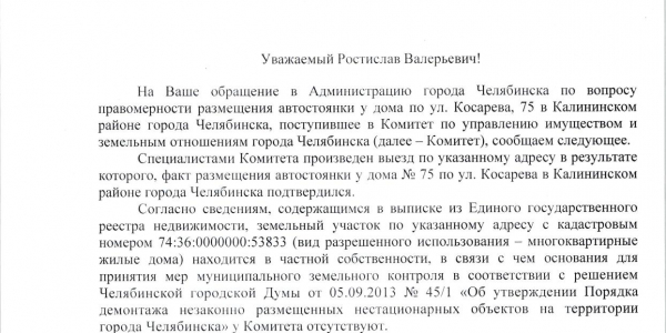 Номер жалобы:37786 Тип жалобы:Иные проблемы ЖКХ Название объекта:ООО «АЖК» Регион:Челябинская область Город:Челябинск Адрес:Косарева 75 Описание жалобы:на прилегающей территории дома №75 по улице Косарева , со стороны строящегося здания №77 организована платная стоянка автомобилей с ограждением и охранником.