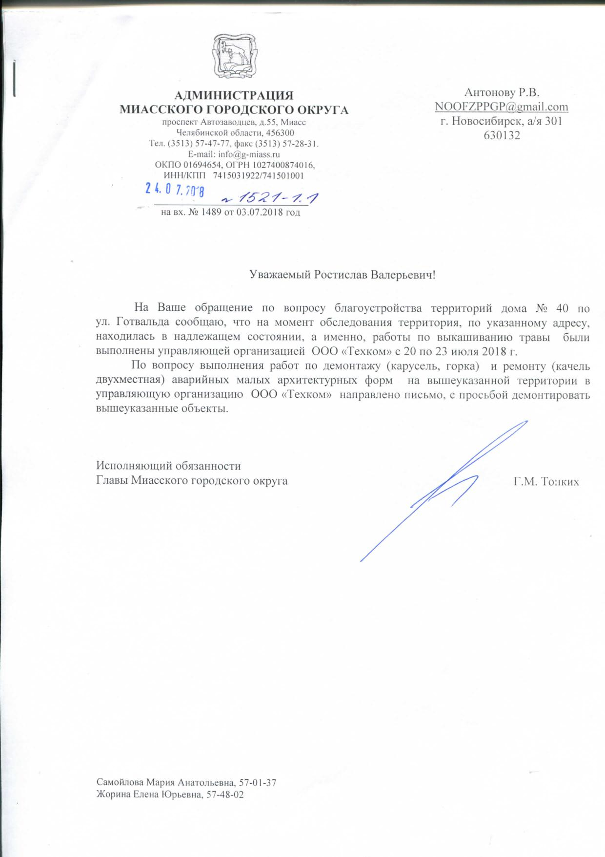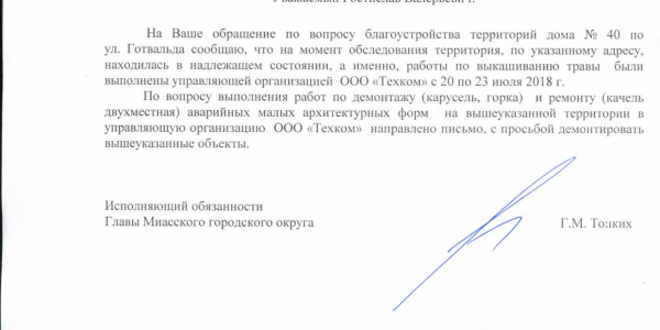 Номер жалобы:37817 Тип жалобы:Иные проблемы ЖКХ Название объекта:Администрация Миасского Городского Округа Регион:Челябинская область Город:Миасс Адрес:ул. Готвальда, 40 Описание жалобы:Здравствуйте. Во дворе дома слишком высокая трава, её необходимо скосить. Также во дворе травмоопасные качели и горка, прошу устранить недостатки, для безопасного нахождения детей во дворе. Статус: