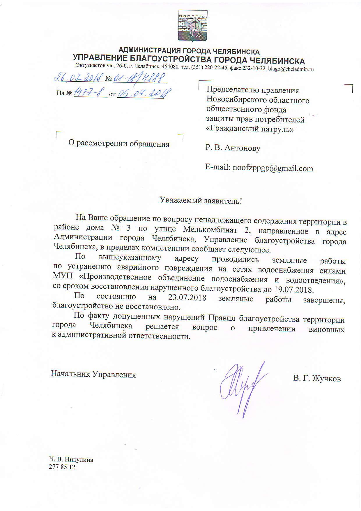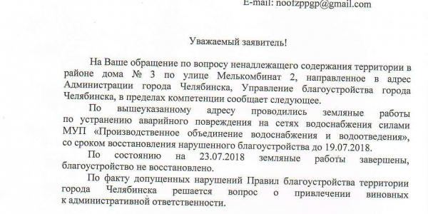 Номер жалобы:37856 Тип жалобы:Иные проблемы ЖКХ Название объекта: Регион:Челябинская область Город:Челябинск Адрес:улица 1-й Участок Мелькомбината 2, 3 Описание жалобы:После замены труб ХВС разрушена и не восстановлена пешеходная дорожка и часть парковки. Статус:
