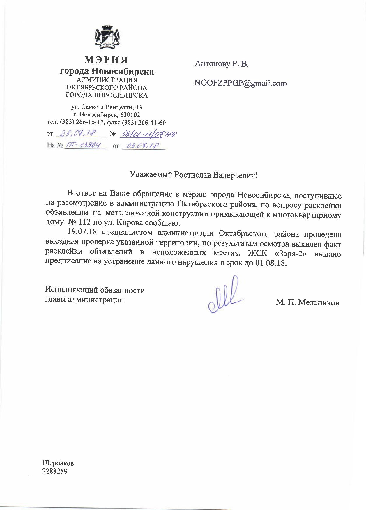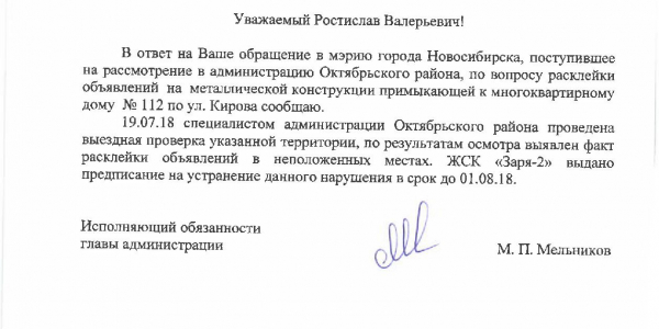 Номер жалобы:37731 Тип жалобы:Иные проблемы ЖКХ Название объекта:Управляющая Компания Регион:Новосибирская область Город:Новосибирск Адрес:ул. Кирова, 110 корпус 2 Описание жалобы:Кирова 112, объявления в неположенном месте Статус: