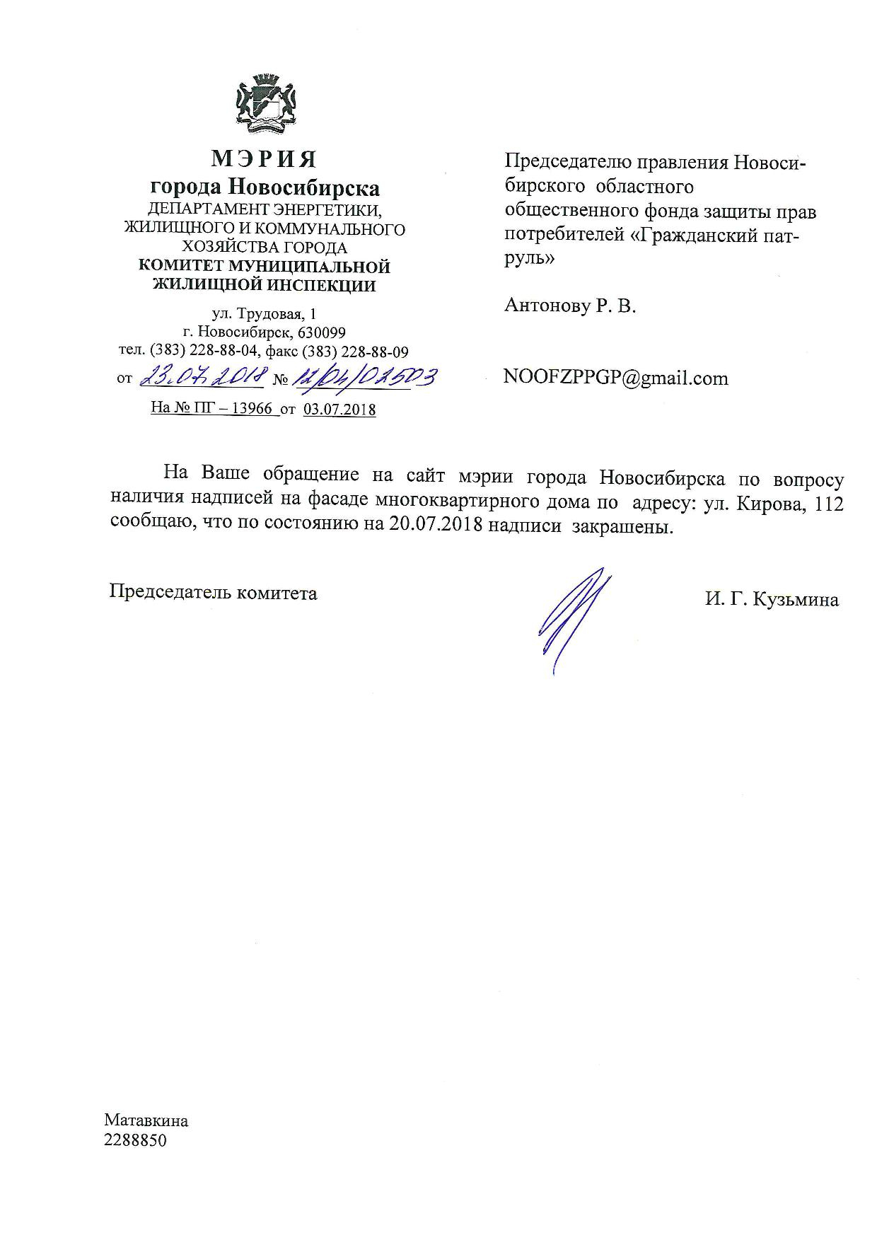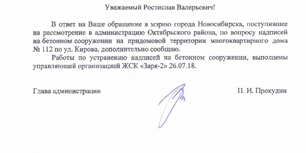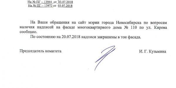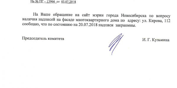 Номер жалобы:37732 Тип жалобы:Иные проблемы ЖКХ Название объекта:Управляющая Компания Регион:Новосибирская область Город:Новосибирск Адрес:ул. Кирова, 110 корпус 2 Описание жалобы:Кирова 112, надписи на фасаде дома Статус: