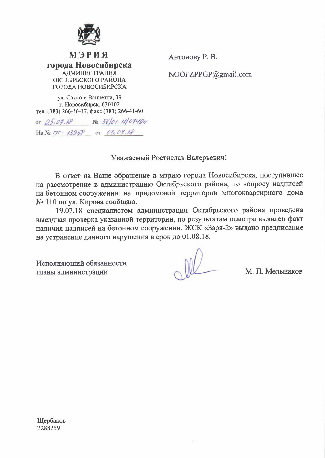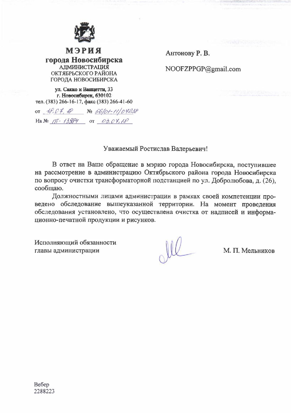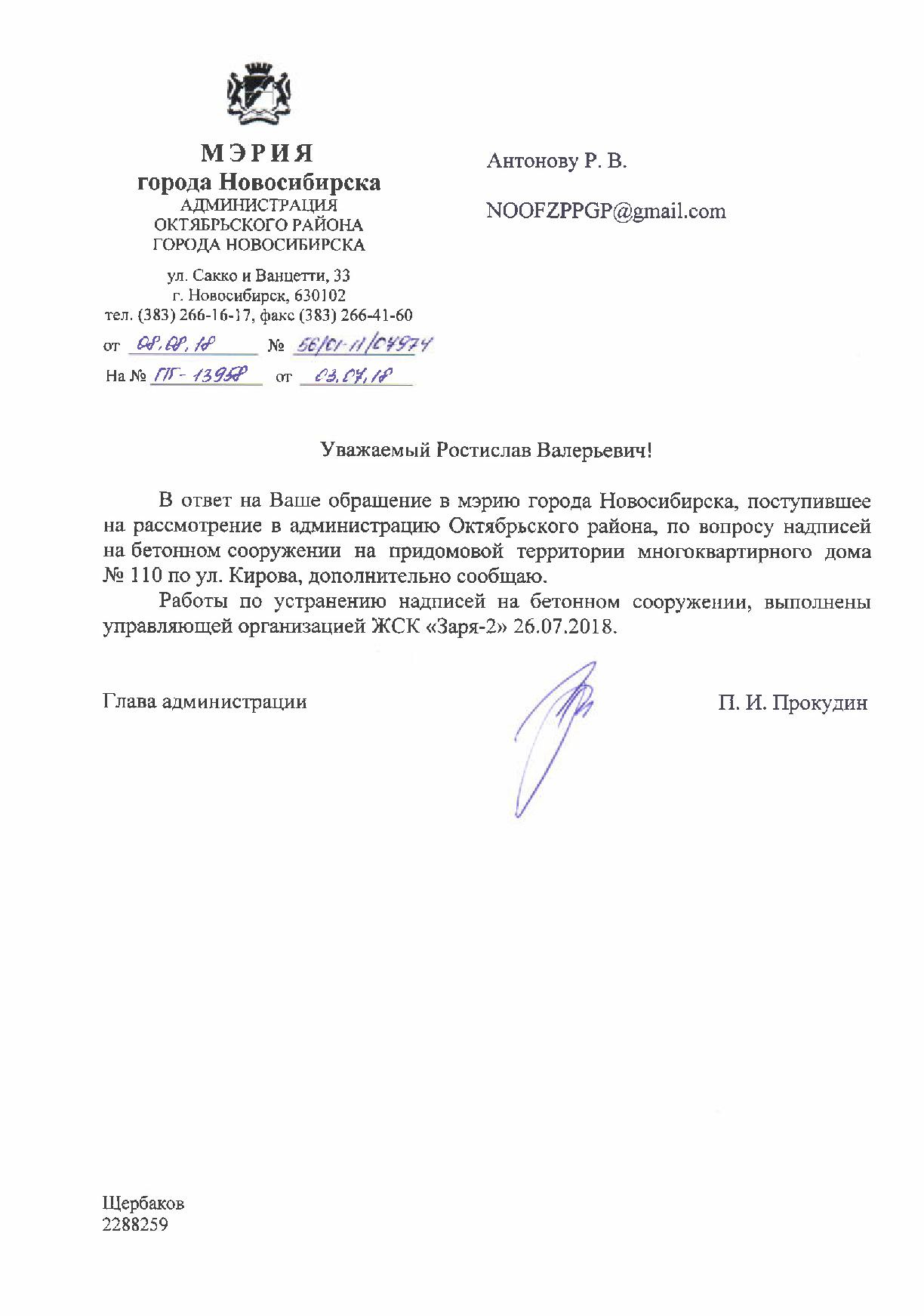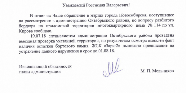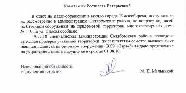 Номер жалобы:37729 Тип жалобы:Иные проблемы ЖКХ Название объекта:Управляющая Компания Регион:Новосибирская область Город:Новосибирск Адрес:ул. Кирова, 110 Описание жалобы:Надписи на заборе Статус: