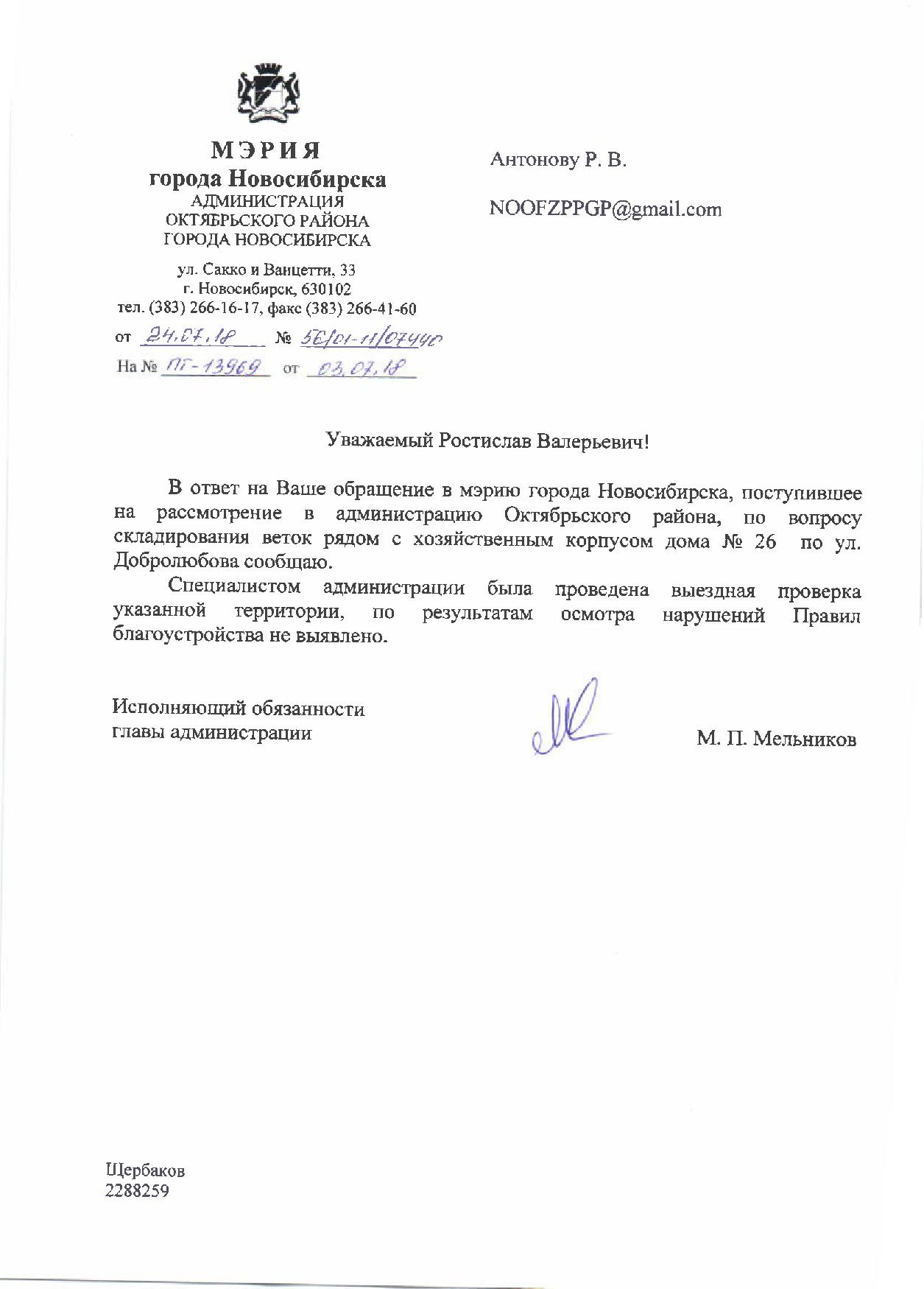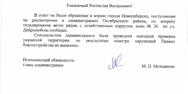 Номер жалобы:37735 Тип жалобы:Иные проблемы ЖКХ Название объекта:Управляющая Компания Регион:Новосибирская область Город:Новосибирск Адрес:ул. Добролюбова, 26 Описание жалобы:Ветки рядом с хозяйственным корпусом Статус: