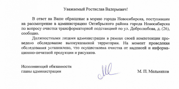 Номер жалобы:37737 Тип жалобы:Иные проблемы ЖКХ Название объекта:Управляющая Компания Регион:Новосибирская область Город:Новосибирск Адрес:ул. Добролюбова, 26 Описание жалобы:Надписи на хозяйственном корпусе Статус:
