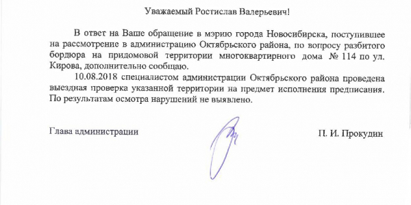 Номер жалобы:37738 Тип жалобы:Иные проблемы ЖКХ Название объекта:Управляющая Компания Регион:Новосибирская область Город:Новосибирск Адрес:ул. Кирова, 114 Описание жалобы:Разбит бордюр Статус: