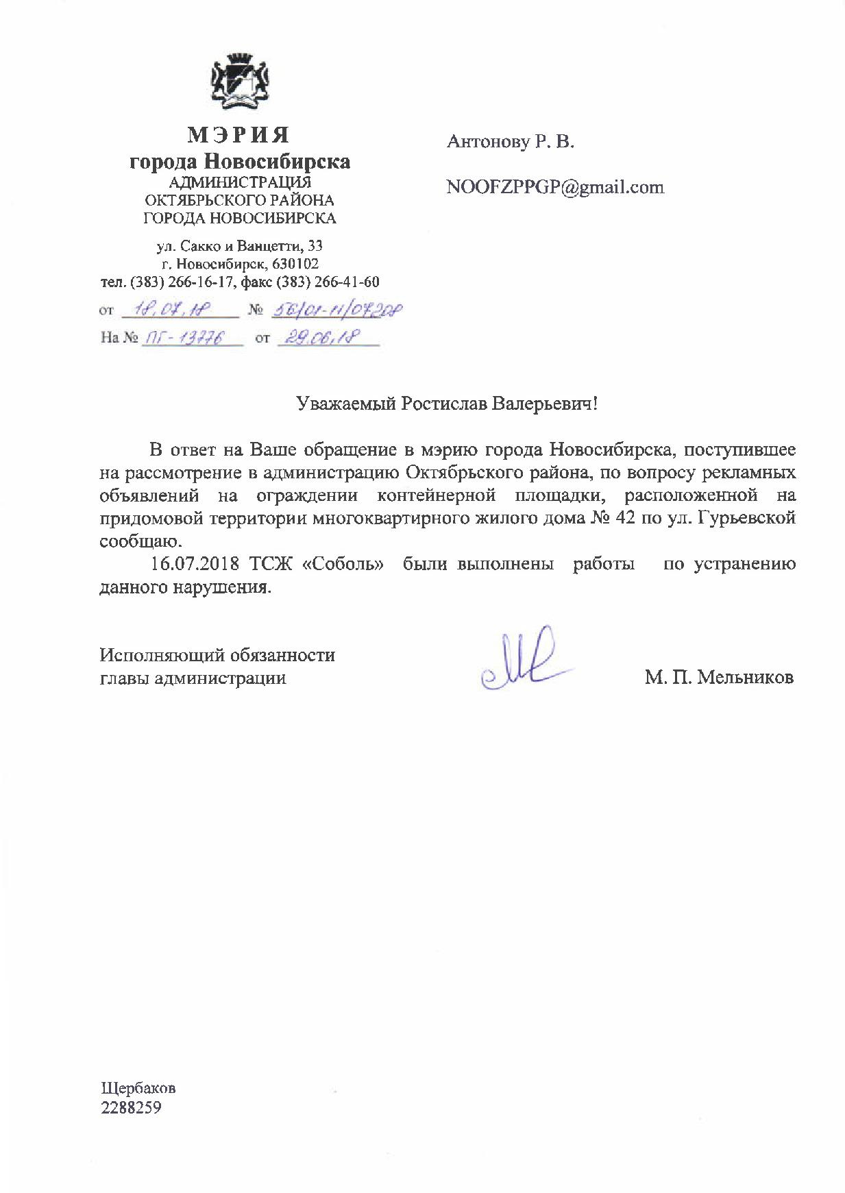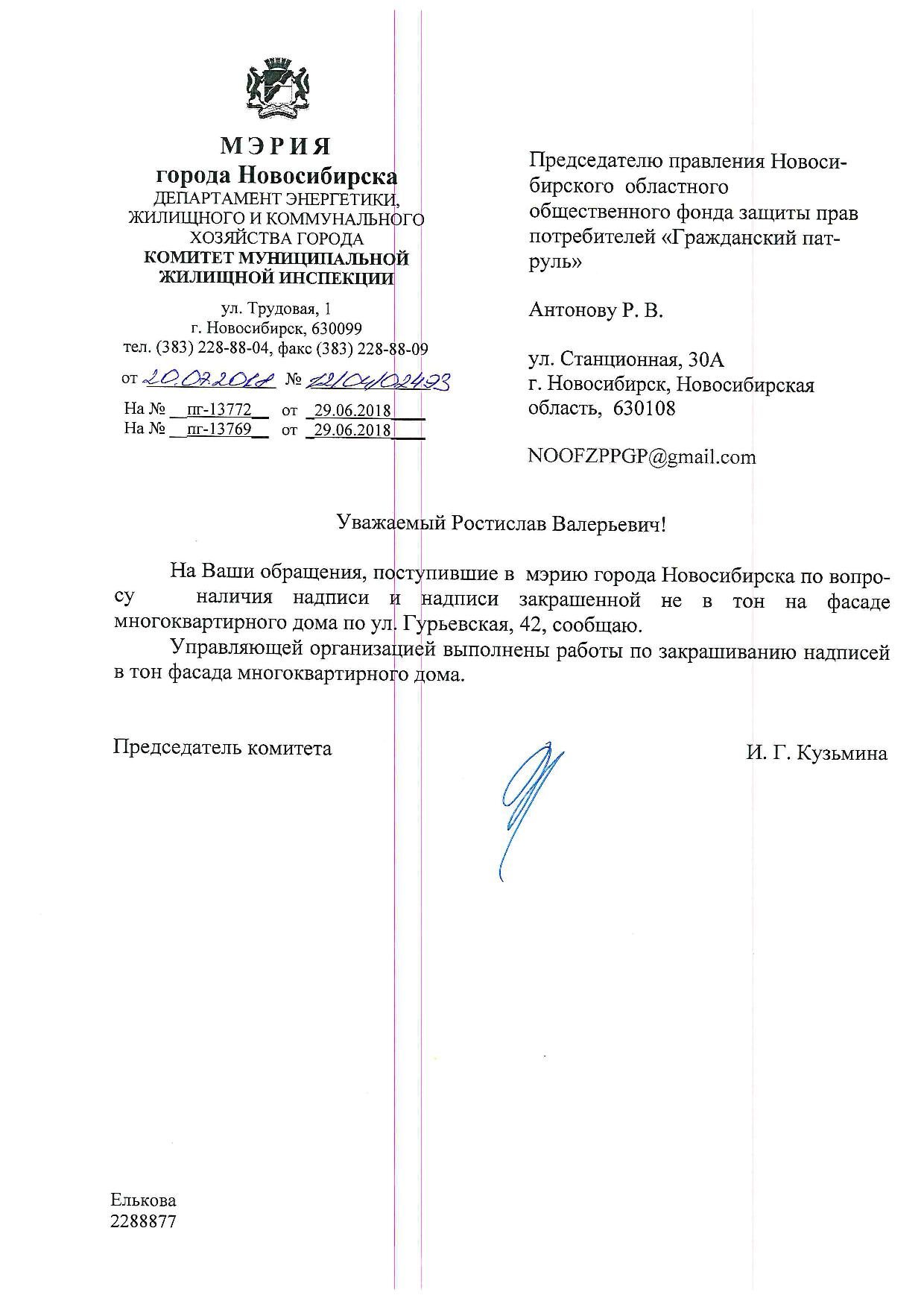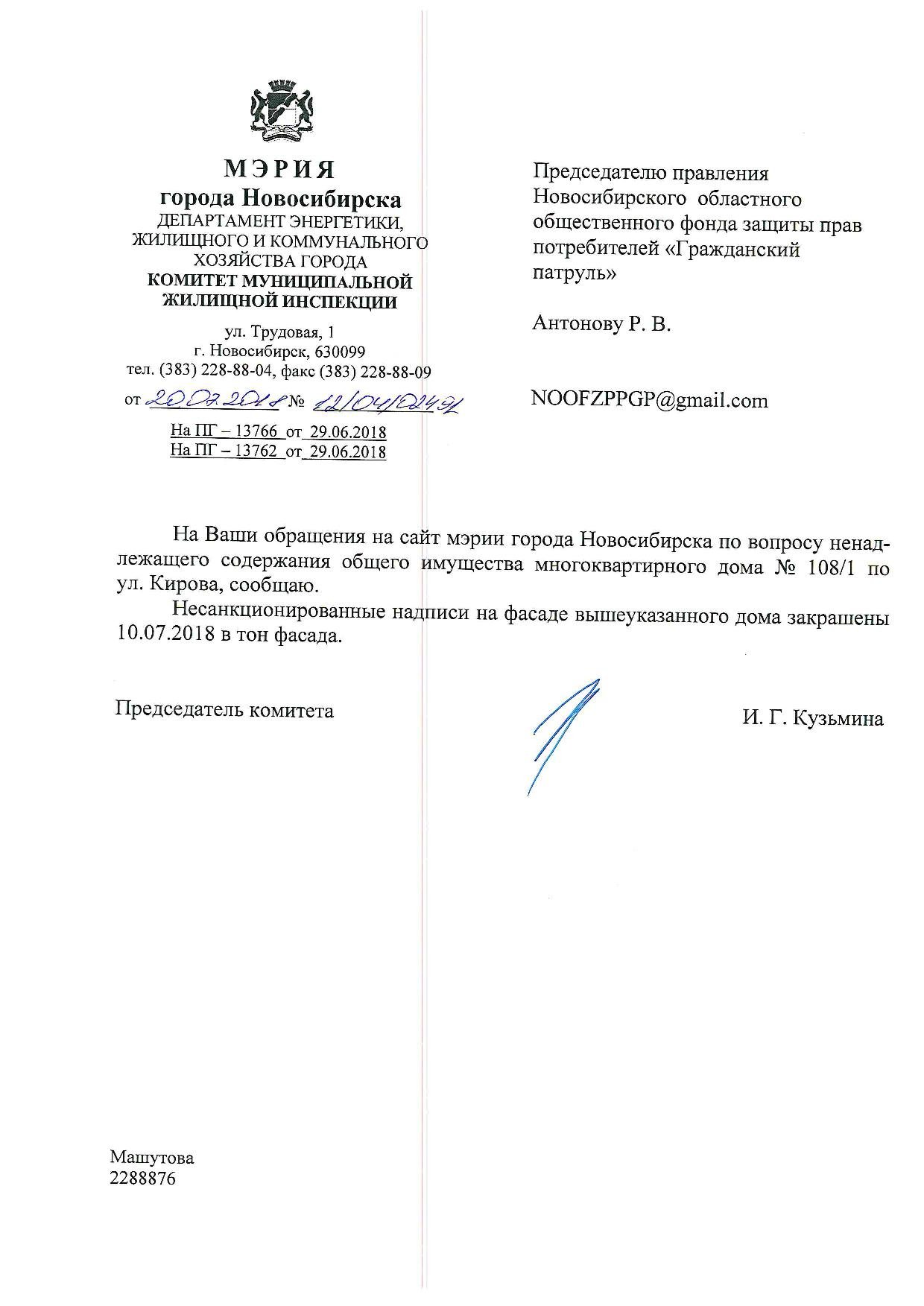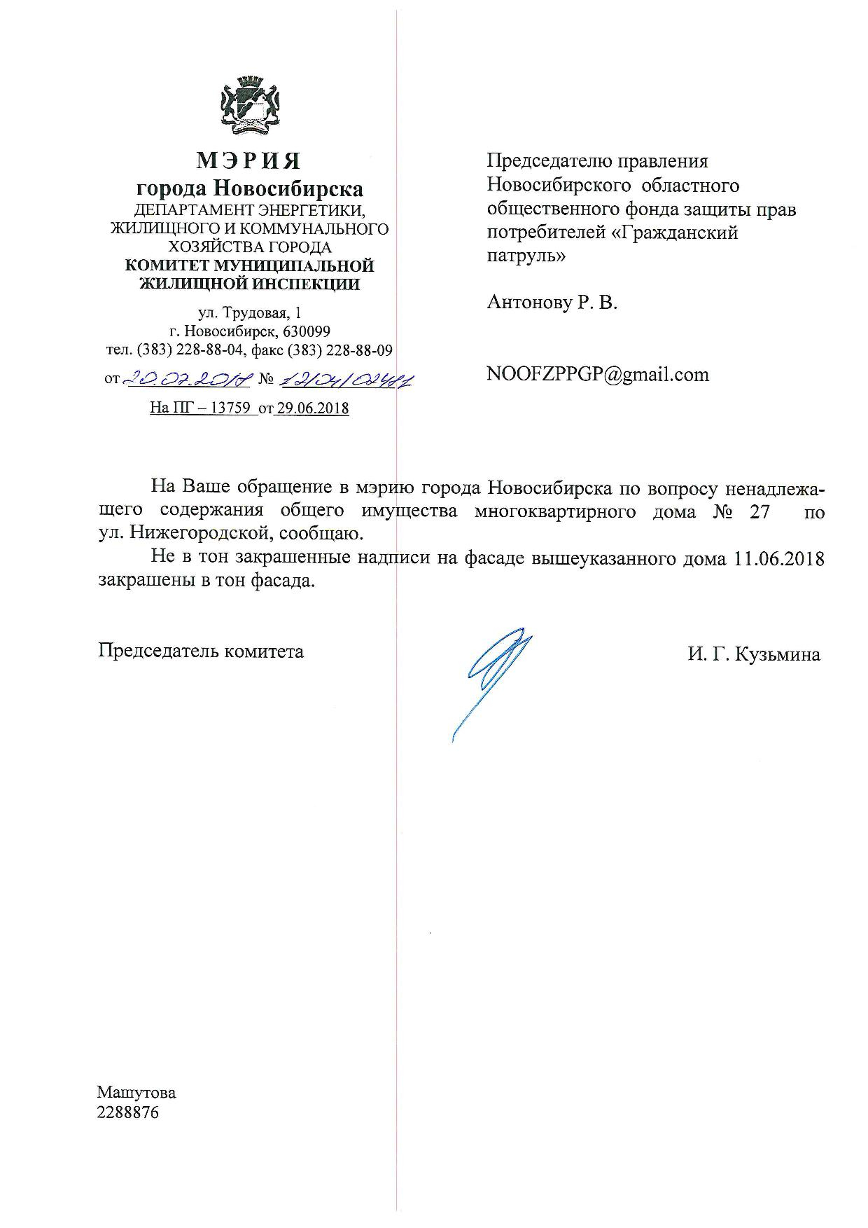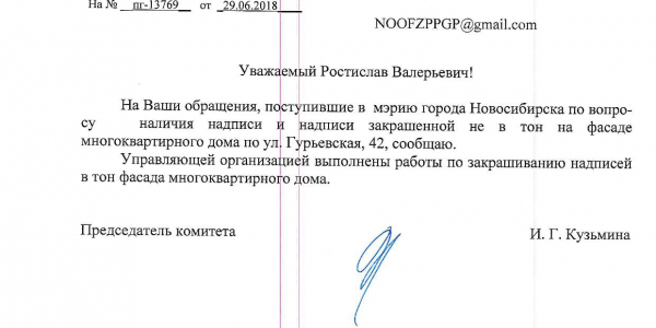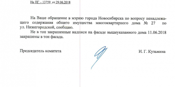 Номер жалобы:37700 Тип жалобы:Иные проблемы ЖКХ Название объекта:Управляющая Компания Регион:Новосибирская область Город:Новосибирск Адрес:ул. Гурьевская, 49 Описание жалобы:Нижегородская 30, надписи закрашены не в тон Статус: