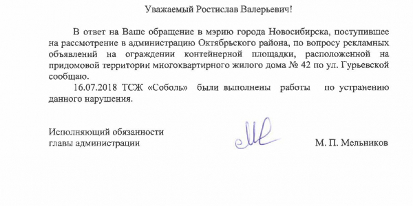 Номер жалобы:37702 Тип жалобы:Иные проблемы ЖКХ Название объекта:Управляющая Компания Регион:Новосибирская область Город:Новосибирск Адрес:ул. Гурьевская, 42 Описание жалобы:Объявления на ограждениях для мусорки Статус: