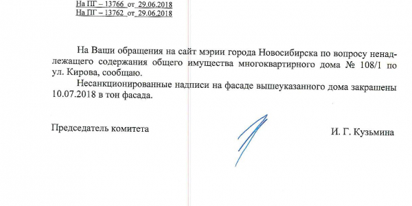 Номер жалобы:37710 Тип жалобы:Иные проблемы ЖКХ Название объекта:Управляющая Компания Регион:Новосибирская область Город:Новосибирск Адрес:ул. Кирова, 108/1 Описание жалобы:Надписи на фасаде дома Статус: