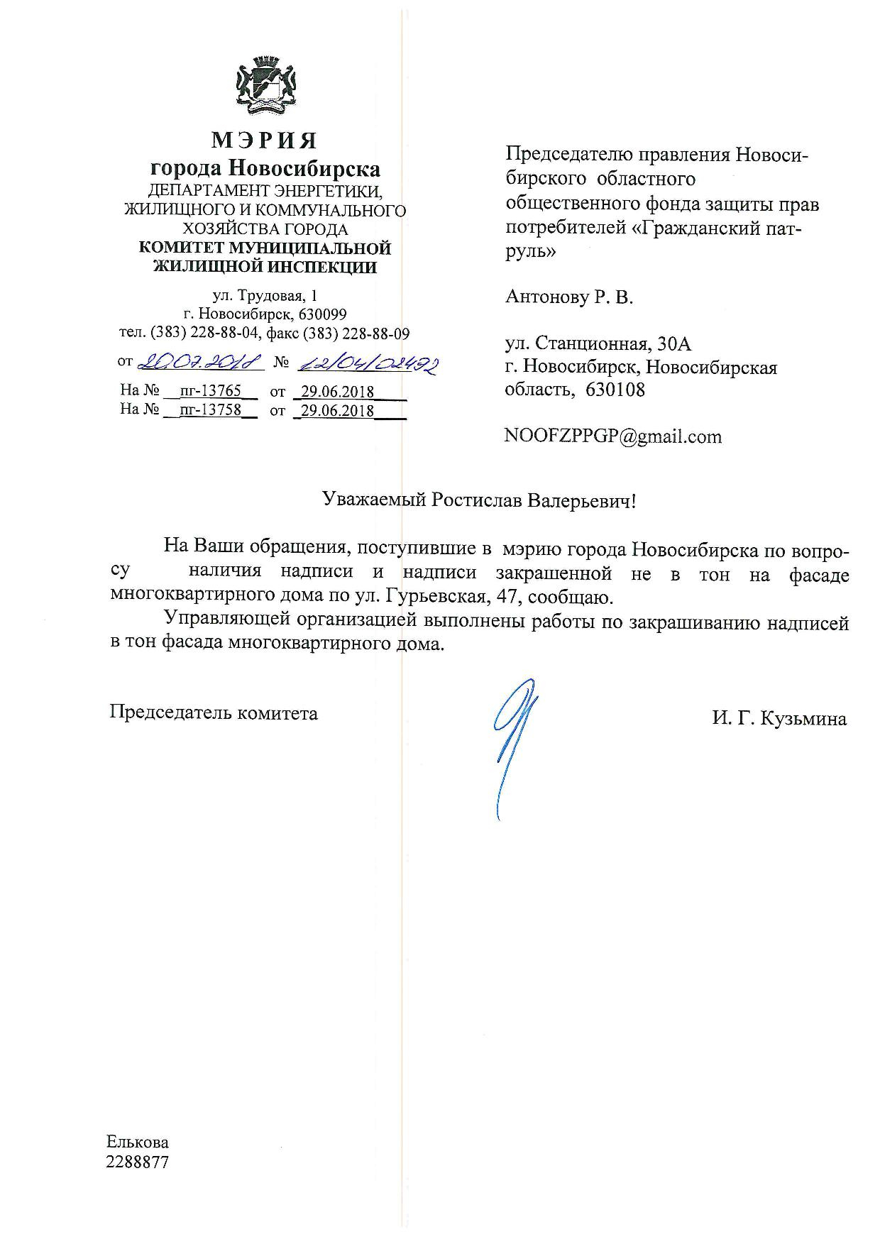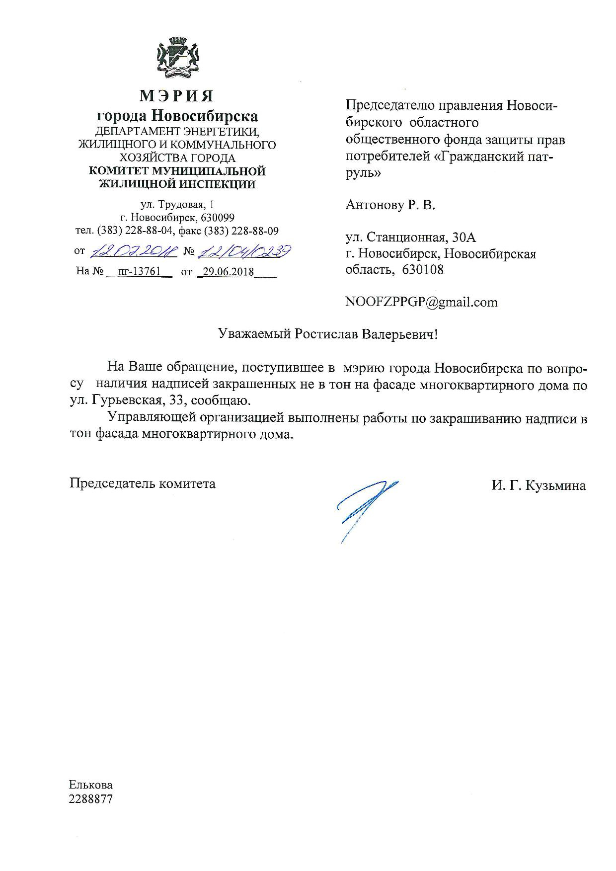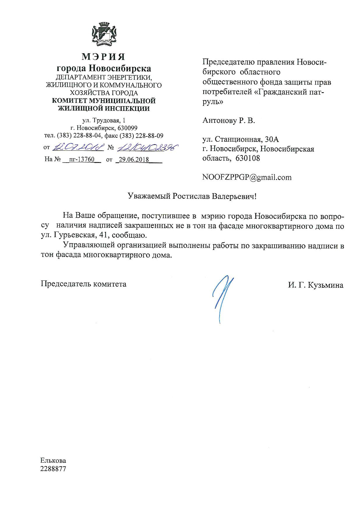 Номер жалобы:37696 Тип жалобы:Иные проблемы ЖКХ Название объекта:Управляющая Компания Регион:Новосибирская область Город:Новосибирск Адрес:ул. Гурьевская, 47 Описание жалобы:Надписи закрашены не в тон Статус: