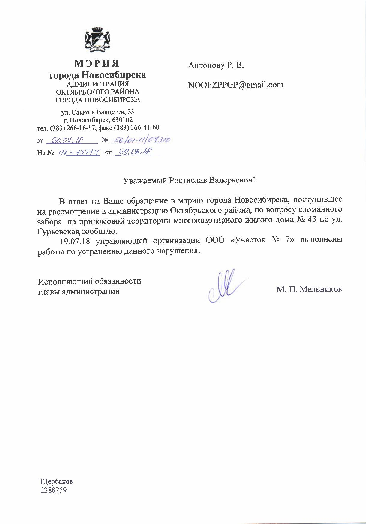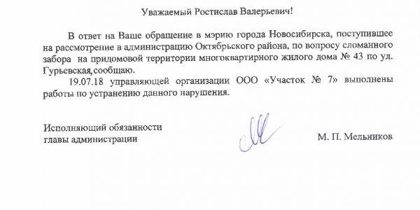 Номер жалобы:37690 Тип жалобы:Иные проблемы ЖКХ Название объекта:Управляющая Компания Регион:Новосибирская область Город:Новосибирск Адрес:ул. Гурьевская, 43 Описание жалобы:Сломан забор Статус: