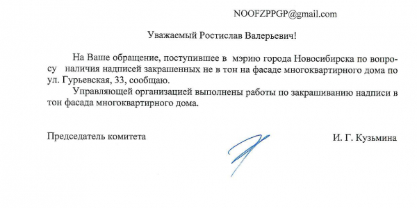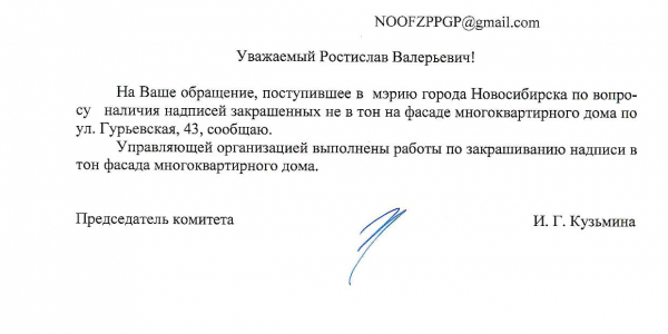 Номер жалобы:37692 Тип жалобы:Иные проблемы ЖКХ Название объекта:Управляющая Компания Регион:Новосибирская область Город:Новосибирск Адрес:ул. Гурьевская, 43 Описание жалобы:Надписи на фасаде дома закрашеныне в тон Статус: