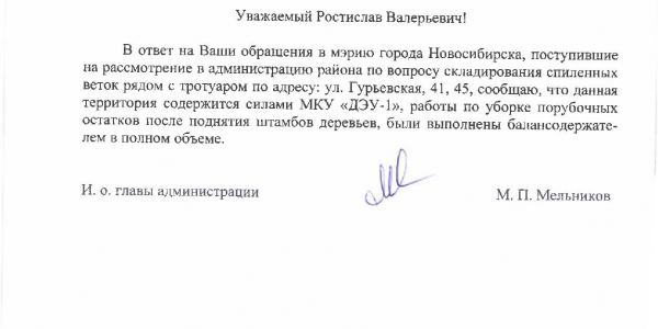Номер жалобы:37688 Тип жалобы:Иные проблемы ЖКХ Название объекта:Управляющая Компания Регион:Новосибирская область Город:Новосибирск Адрес:ул. Гурьевская, 41 Описание жалобы:Не убраны ветки напротив дома Статус: