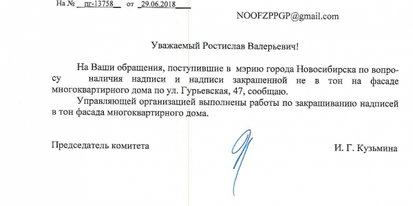 Номер жалобы:37694 Тип жалобы:Иные проблемы ЖКХ Название объекта:Управляющая Компания Регион:Новосибирская область Город:Новосибирск Адрес:ул. Гурьевская, 45 Описание жалобы:Надписи на фасаде дома Статус: