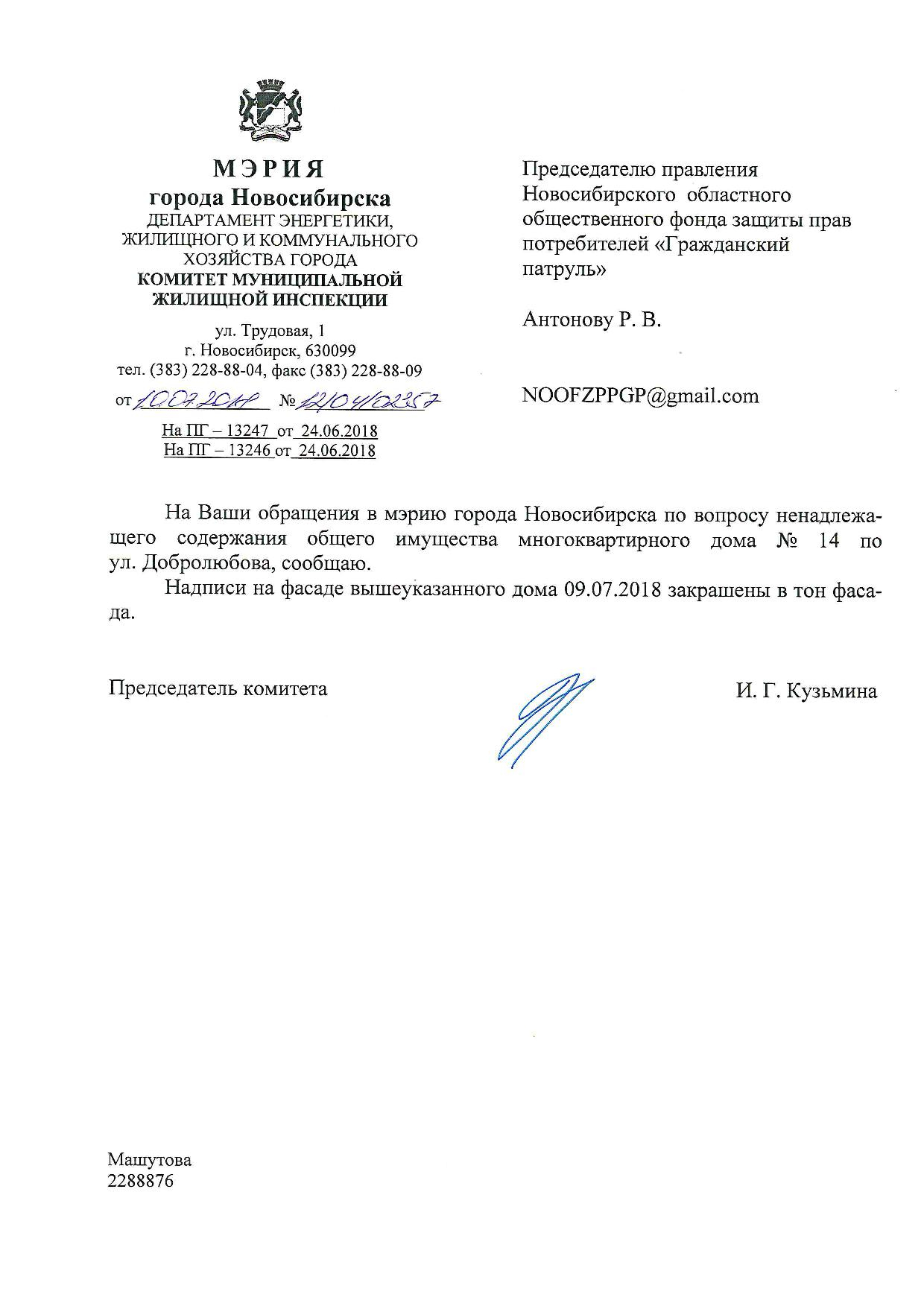 Номер жалобы:37307 Тип жалобы:Иные проблемы ЖКХ Название объекта:Управляющая Компания Регион:Новосибирская область Город:Новосибирск Адрес:ул. Добролюбова, 12/1 Описание жалобы:Надписи закрашены не в тон Статус: