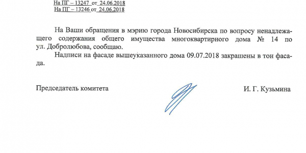 Номер жалобы:37302 Тип жалобы:Иные проблемы ЖКХ Название объекта:Управляющая Компания Регион:Новосибирская область Город:Новосибирск Адрес:ул. Добролюбова, 14 Описание жалобы:Надписи на фасаде дома Статус: