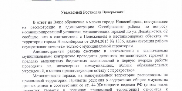 Номер жалобы:37309 Тип жалобы:Иные проблемы ЖКХ Название объекта:Управляющая Компания Регион:Новосибирская область Город:Новосибирск Адрес:ул. Декабристов, 62 Описание жалобы:Объявления на гараже Статус: