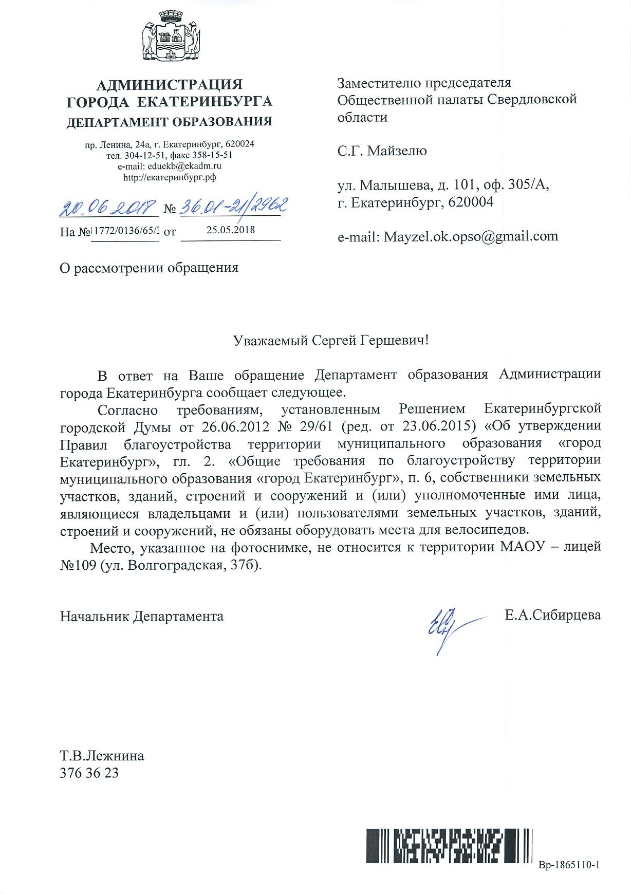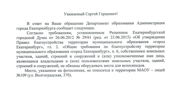 Номер жалобы:36222 Тип жалобы:Иные проблемы ЖКХ Название объекта:Школа 109 Регион:Свердловская область Город:Екатеринбург Адрес:ул. Волгоградская, 37Б Описание жалобы:На территории школы не оборудовано место для велосипедов Статус: