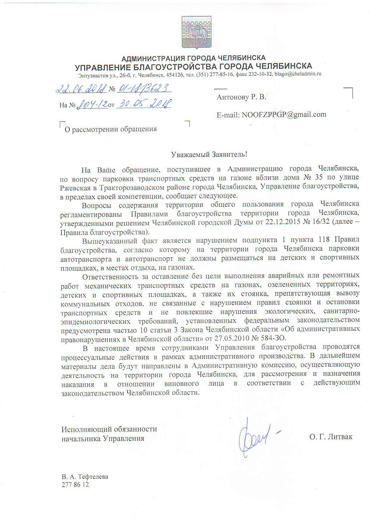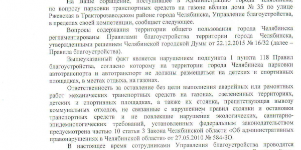 Номер жалобы:36393 Тип жалобы:Иные проблемы ЖКХ Название объекта:Нет Регион:Челябинская область Город:Челябинск Адрес:ул. Ржевская, 35 Описание жалобы:Ставят автомобили во дворе на газон! От газона почти уже ничего не осталось. Так же во дворе находится заброшенное строение в виде павильона. Вывеска продукты Статус: