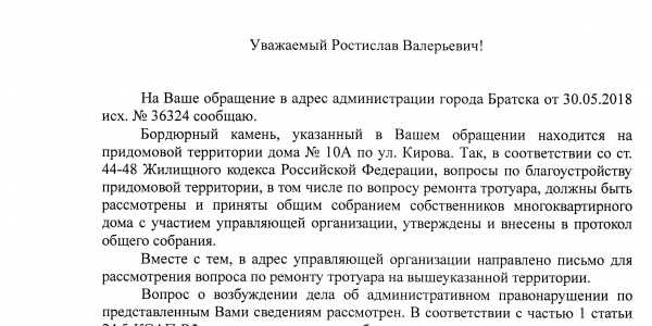 Номер жалобы:36324 Тип жалобы:Иные проблемы ЖКХ Название объекта:ООО УК "Жилсервис" Регион:Иркутская область Город:Братск Адрес:ул. Кирова, 10а Описание жалобы:На углу дома 10а, в районе первого подъезда разломан бордюрный камень. Статус: