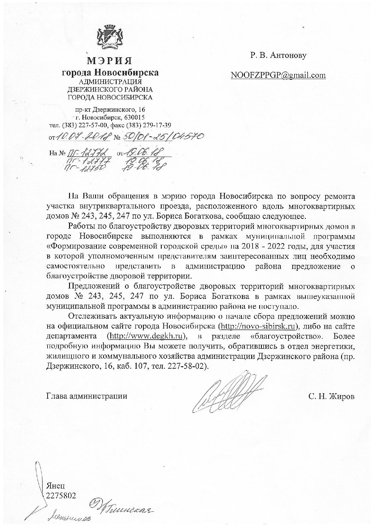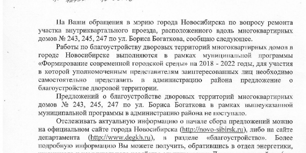 Номер жалобы:36055 Тип жалобы:Иные проблемы ЖКХ Название объекта:Управляющая Компания Регион:Новосибирская область Город:Новосибирск Адрес:ул. Бориса Богаткова, 245 Описание жалобы:Разбита межквартальная дорога Статус: