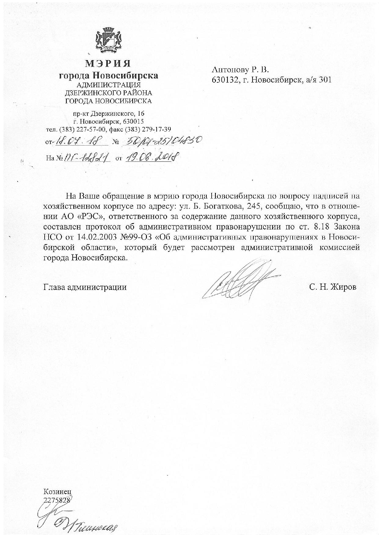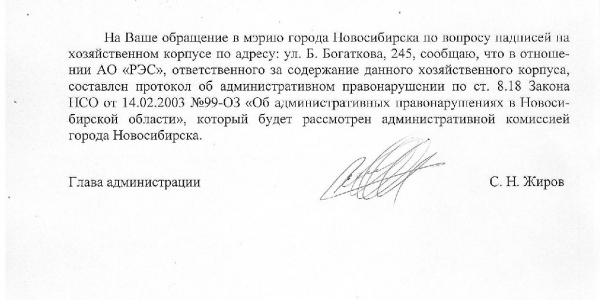 Номер жалобы:36049 Тип жалобы:Иные проблемы ЖКХ Название объекта:Управляющая Компания Регион:Новосибирская область Город:Новосибирск Адрес:ул. Бориса Богаткова, 245 Описание жалобы:Надписи на хозяйственном корпусе Статус: