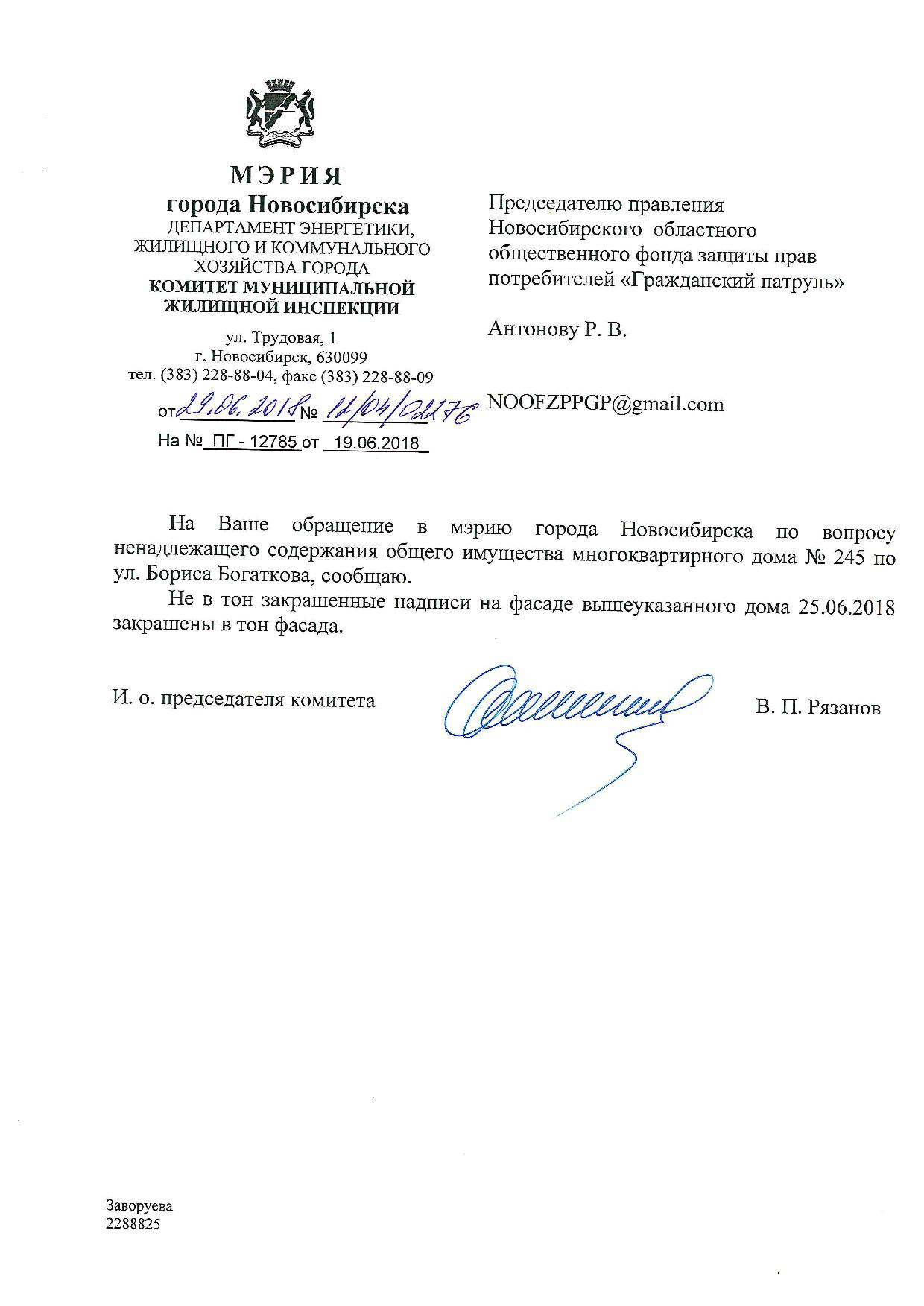 Номер жалобы:36058 Тип жалобы:Иные проблемы ЖКХ Название объекта:Управляющая Компания Регион:Новосибирская область Город:Новосибирск Адрес:ул. Бориса Богаткова, 245 Описание жалобы:Надписи закрашены не в тон Статус: