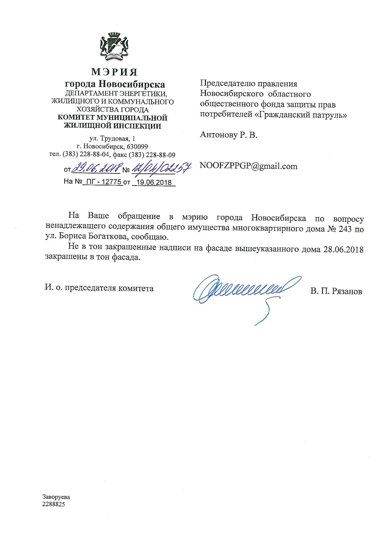 Номер жалобы:36056 Тип жалобы:Иные проблемы ЖКХ Название объекта:Управляющая Компания Регион:Новосибирская область Город:Новосибирск Адрес:ул. Бориса Богаткова, 243 Описание жалобы:Надписи закрашены не в тон Статус:
