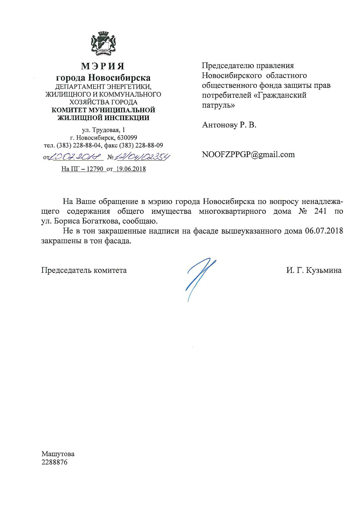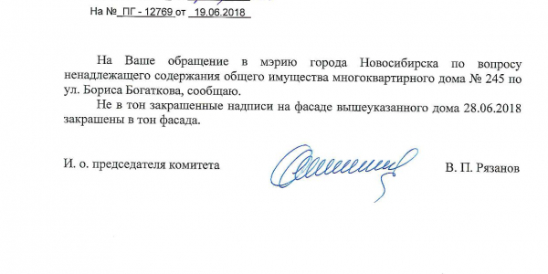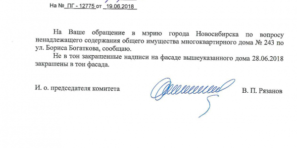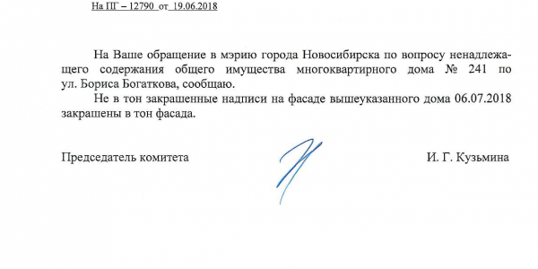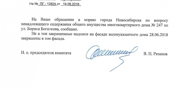 Номер жалобы:36059 Тип жалобы:Иные проблемы ЖКХ Название объекта:Управляющая Компания Регион:Новосибирская область Город:Новосибирск Адрес:ул. Бориса Богаткова, 241 Описание жалобы:Надписи закрашены не в тон Статус: