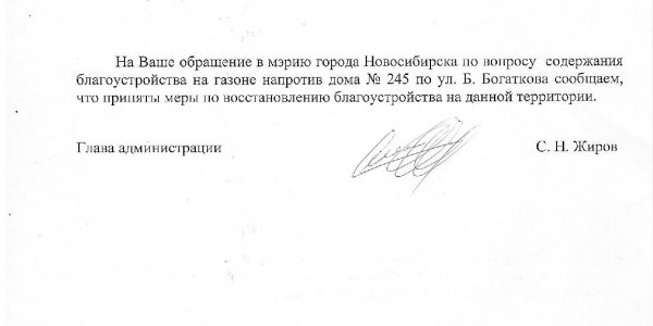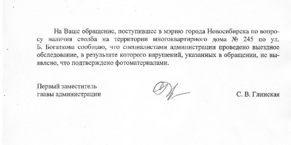 Номер жалобы:36052 Тип жалобы:Иные проблемы ЖКХ Название объекта:Управляющая Компания Регион:Новосибирская область Город:Новосибирск Адрес:ул. Бориса Богаткова, 245 Описание жалобы:Во дворе не убран столб Статус: