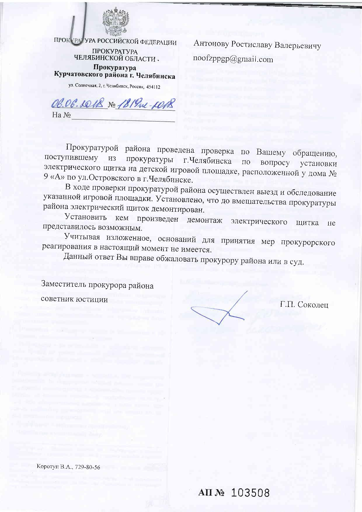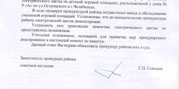 Номер жалобы:35966 Тип жалобы:Иные проблемы ЖКХ Название объекта:Администрация Калининского района Регион:Челябинская область Город:Челябинск Адрес:ул. Островского, 9А Описание жалобы:Щиток электропитания на детской площадке! Статус: