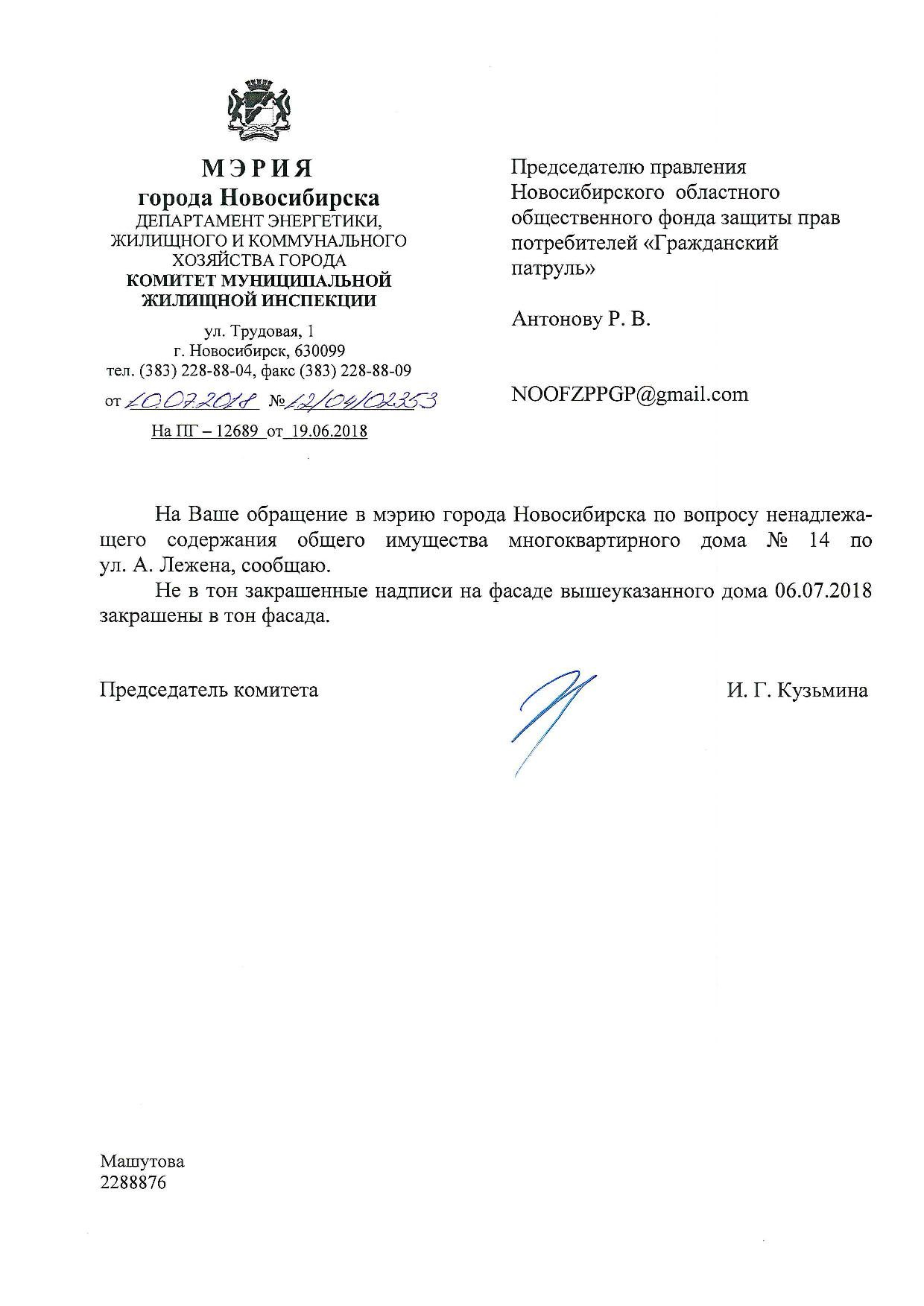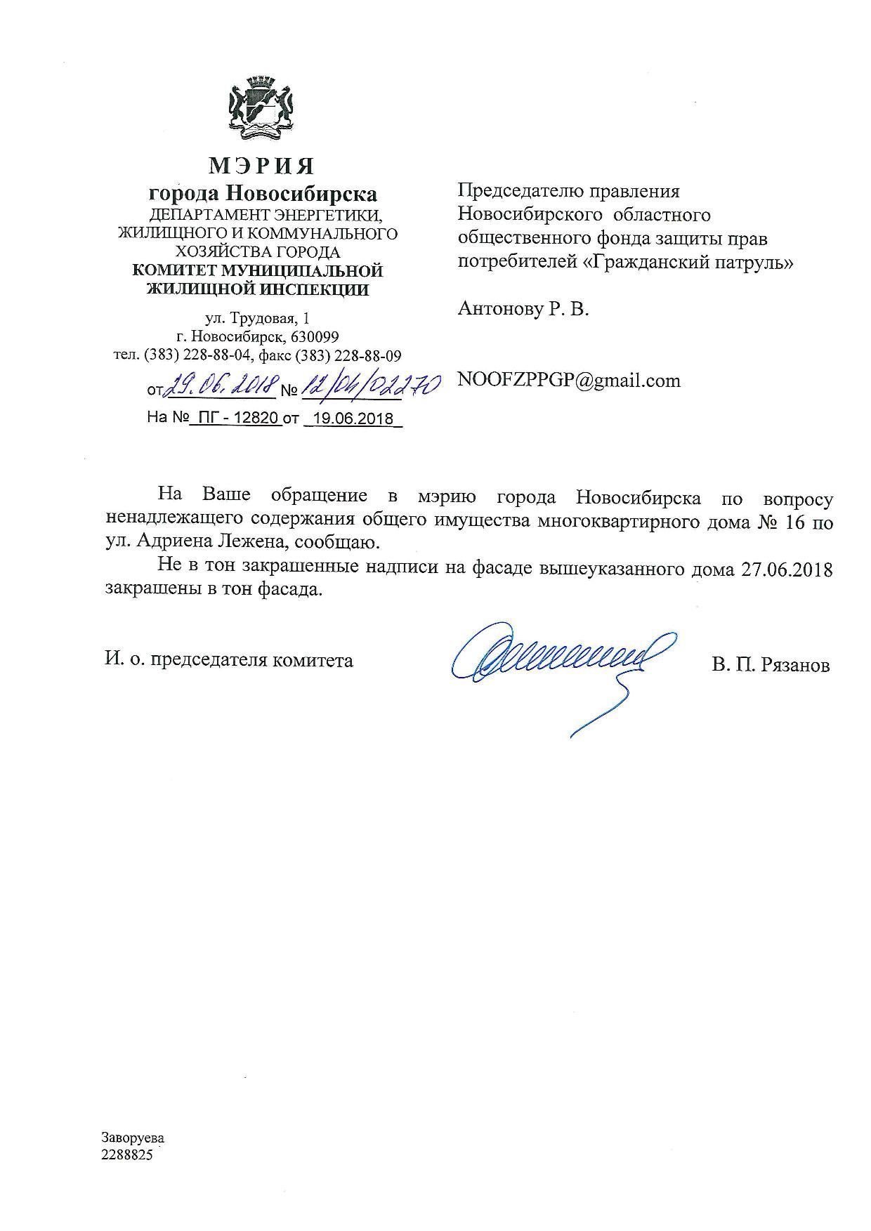 Номер жалобы:36030 Тип жалобы:Иные проблемы ЖКХ Название объекта:Управляющая Компания Регион:Новосибирская область Город:Новосибирск Адрес:ул. Адриена Лежена, 14 Описание жалобы:Надписи закрашены не в тон Статус:
