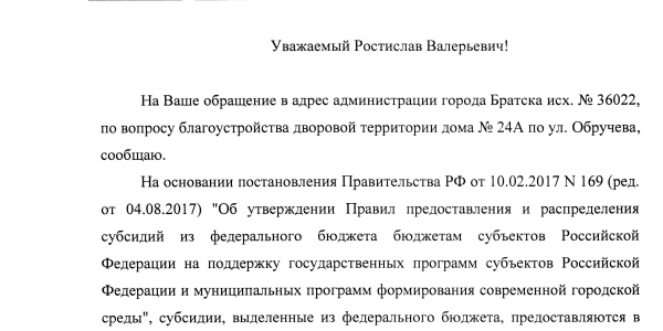 Номер жалобы:35981 Тип жалобы:Иные проблемы ЖКХ Название объекта: Регион:Иркутская область Город:Братск Адрес:улица Обручева, 9А Описание жалобы:Перед тротуаром на внутридворовой дороге около школы №5 постоянно в дождь образуется огромная лужа Статус: