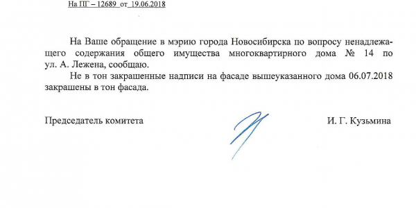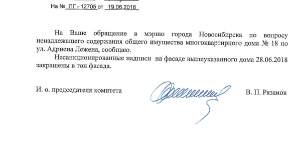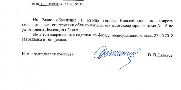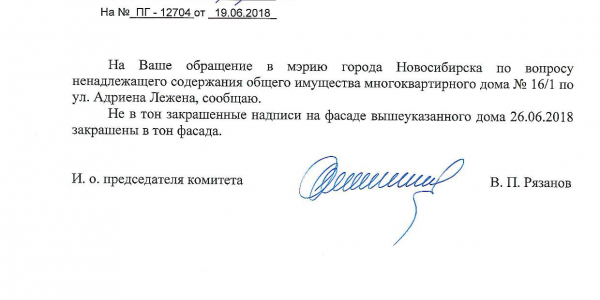Номер жалобы:36035 Тип жалобы:Иные проблемы ЖКХ Название объекта:Управляющая Компания Регион:Новосибирская область Город:Новосибирск Адрес:ул. Адриена Лежена, 18 Описание жалобы:Надписи на фасаде дома Статус: