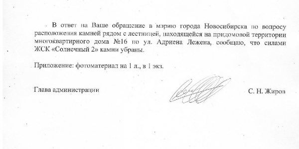 Номер жалобы:36033 Тип жалобы:Иные проблемы ЖКХ Название объекта:Управляющая Компания Регион:Новосибирская область Город:Новосибирск Адрес:ул. Адриена Лежена, 16 Описание жалобы:Камни рядом с лестницей Статус: