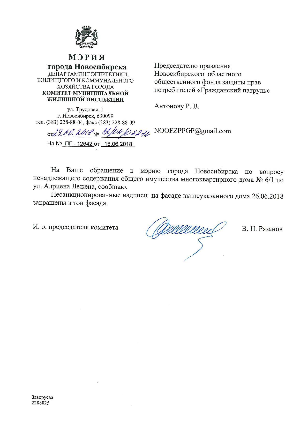 Номер жалобы:35941 Тип жалобы:Иные проблемы ЖКХ Название объекта:Управляющая Компания Регион:Новосибирская область Город:Новосибирск Адрес:ул. Адриена Лежена, 6/2 Описание жалобы:Надписи на фасаде дома Статус: