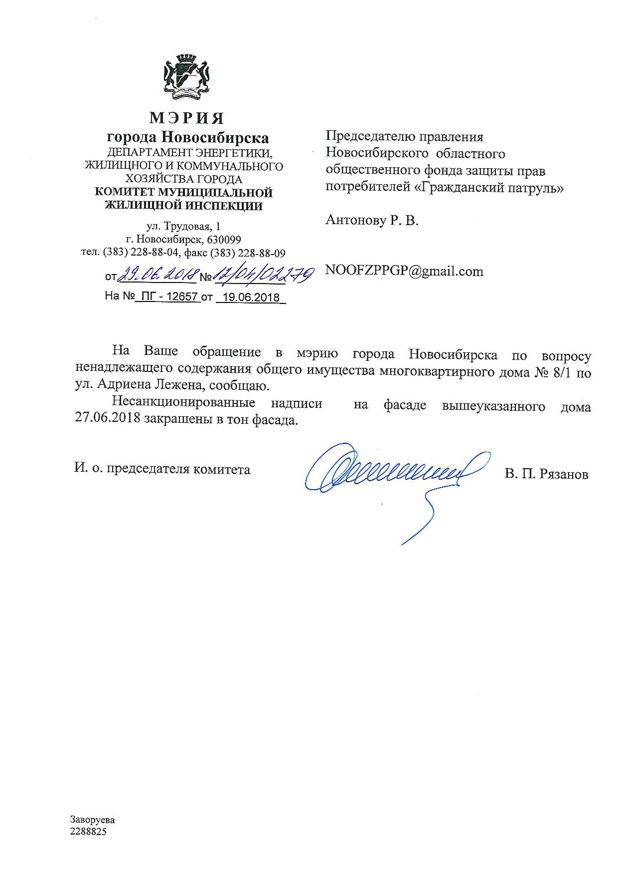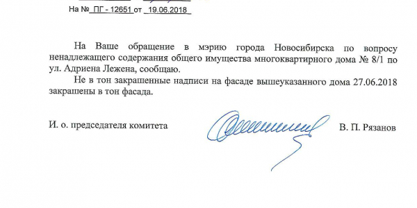 Номер жалобы:35946 Тип жалобы:Иные проблемы ЖКХ Название объекта:Управляющая Компания Регион:Новосибирская область Город:Новосибирск Адрес:ул. Адриена Лежена, 8/1 Описание жалобы:Надписи закрашены не в тон Статус:
